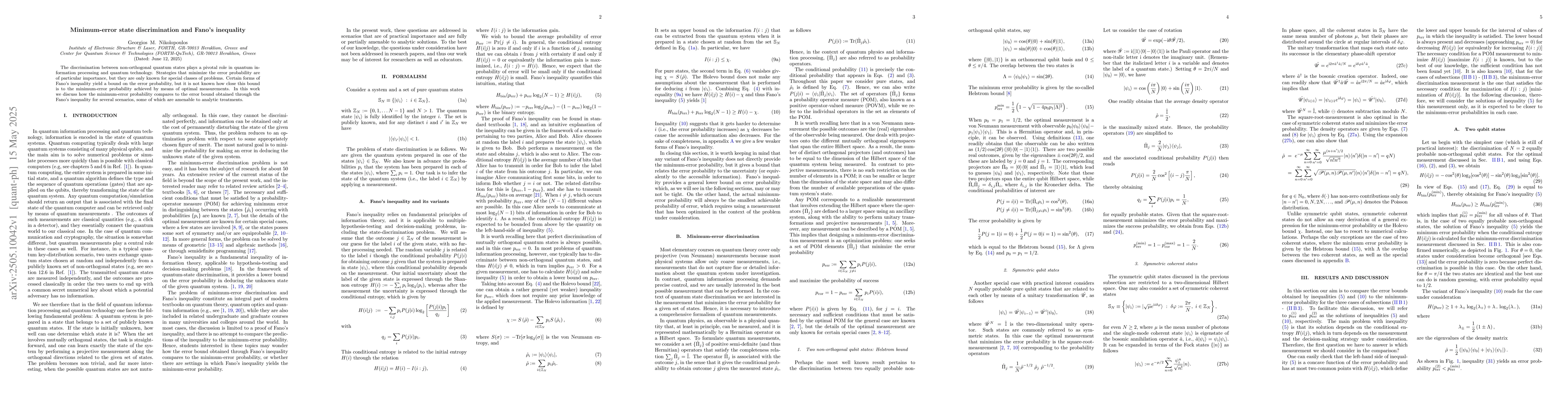 Research investigates the minimum error probability for discriminating between non-orthogonal quantum states using optimal measurements, comparing it to Fano's inequality bounds. The study finds a closer bound to the true minimum-error probability in certain scenarios.