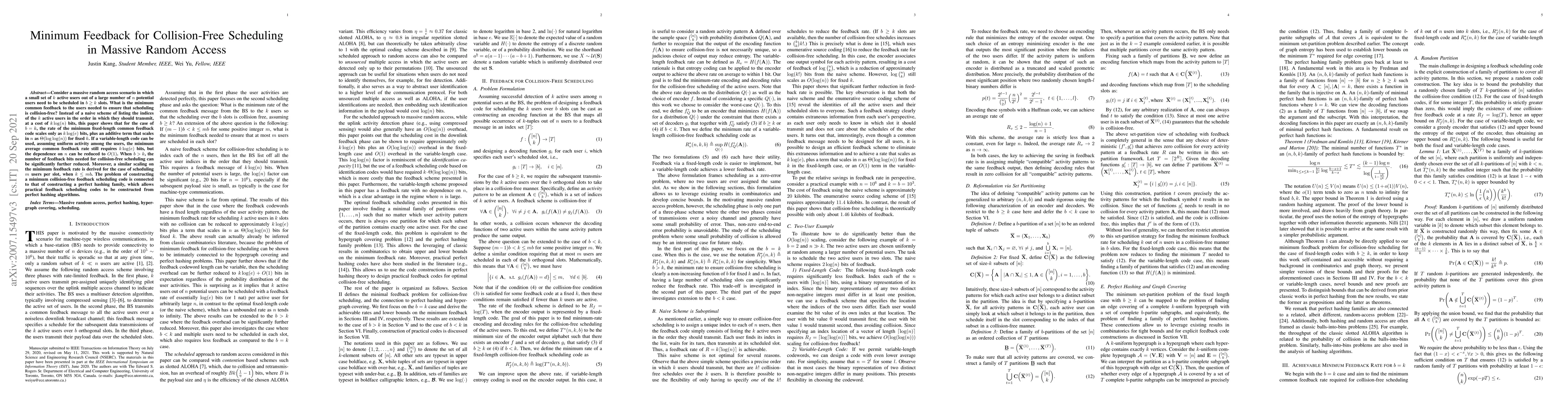 Consider a massive random access scenario in which a small set of $k$ active users out of a large number of $n$ potential users need to be scheduled in $b\ge k$ slots. What is the minimum common feedback to the users needed to ensure that scheduling is collision-free? Instead of a naive scheme of listing the indices of the $k$ active users in the order in which they should transmit, at a cost of $k\log(n)$ bits, this paper shows that for the case of $b=k$, the rate of the minimum fixed-length common feedback code scales only as $k \log(e)$ bits, plus an additive term that scales in $n$ as $\Theta \left(\log \log(n) \right)$ for fixed $k$. If a variable-length code can be used, assuming uniform activity among the users, the minimum average common feedback rate still requires $k \log(e)$ bits, but the dependence on $n$ can be reduced to $O(1)$. When $b>k$, the number of feedback bits needed for collision-free scheduling can be significantly further reduced. Moreover, a similar scaling on the minimum feedback rate is derived for the case of scheduling $m$ users per slot, when $k \le mb$. The problem of constructing a minimum collision-free feedback scheduling code is connected to that of constructing a perfect hashing family, which allows practical feedback scheduling codes to be constructed from perfect hashing algorithms.
