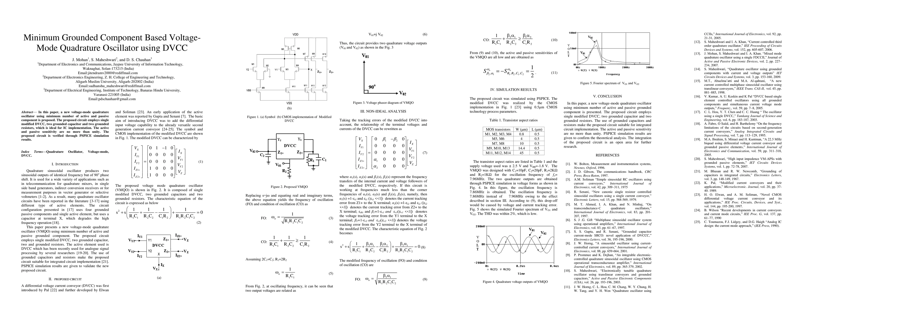 This paper proposes a voltage-mode quadrature oscillator using a minimum number of components, specifically a single modified DVCC, two grounded capacitors, and two grounded resistors. The design ensures low sensitivity and is ideal for IC implementation, verified by PSPICE simulations.