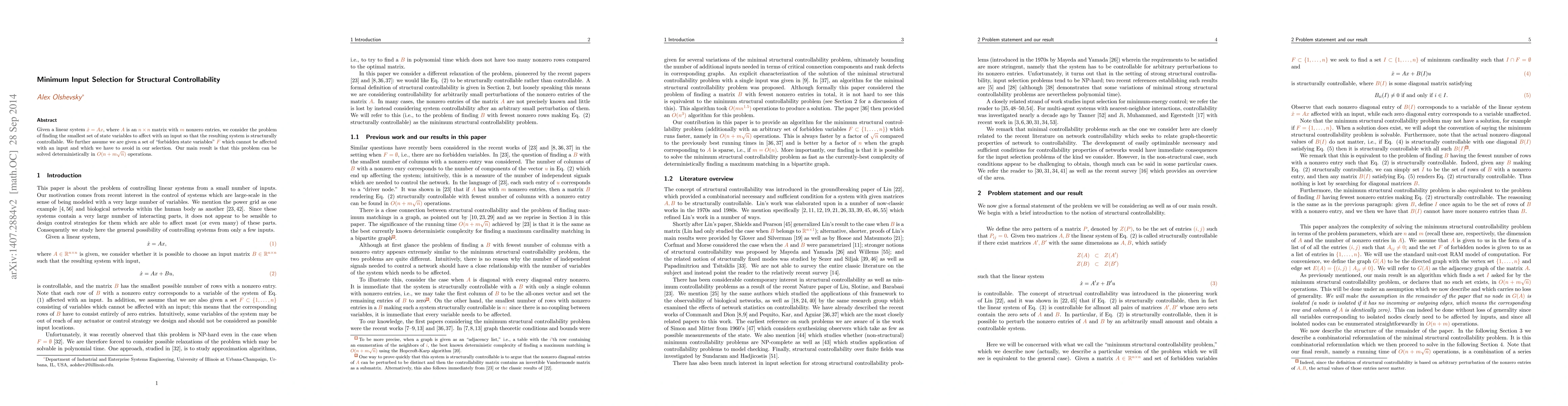 Given a linear system $\dot{x} = Ax$, where $A$ is an $n \times n$ matrix with $m$ nonzero entries, we consider the problem of finding the smallest set of state variables to affect with an input so that the resulting system is structurally controllable. We further assume we are given a set of "forbidden state variables" $F$ which cannot be affected with an input and which we have to avoid in our selection. Our main result is that this problem can be solved deterministically in $O(n+m \sqrt{n})$ operations.