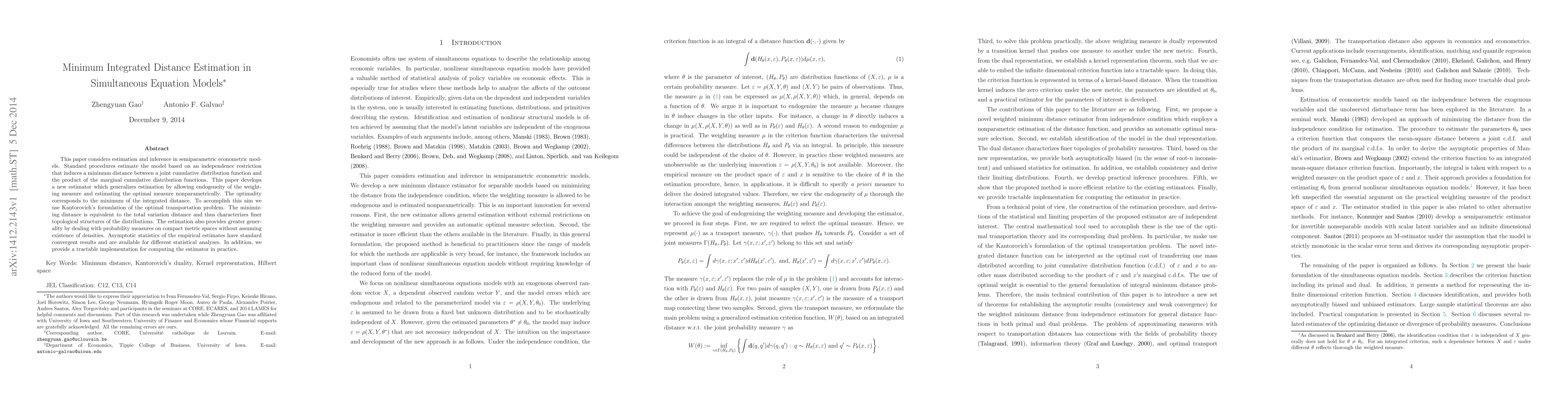 This paper considers estimation and inference in semiparametric econometric models. Standard procedures estimate the model based on an independence restriction that induces a minimum distance between a joint cumulative distribution function and the product of the marginal cumulative distribution functions. This paper develops a new estimator which generalizes estimation by allowing endogeneity of the weighting measure and estimating the optimal measure nonparametrically. The optimality corresponds to the minimum of the integrated distance. To accomplish this aim we use Kantorovich's formulation of the optimal transportation problem. The minimizing distance is equivalent to the total variation distance and thus characterizes finer topological structures of the distributions. The estimation also provides greater generality by dealing with probability measures on compact metric spaces without assuming existence of densities. Asymptotic statistics of the empirical estimates have standard convergent results and are available for different statistical analyses. In addition, we provide a tractable implementation for computing the estimator in practice.