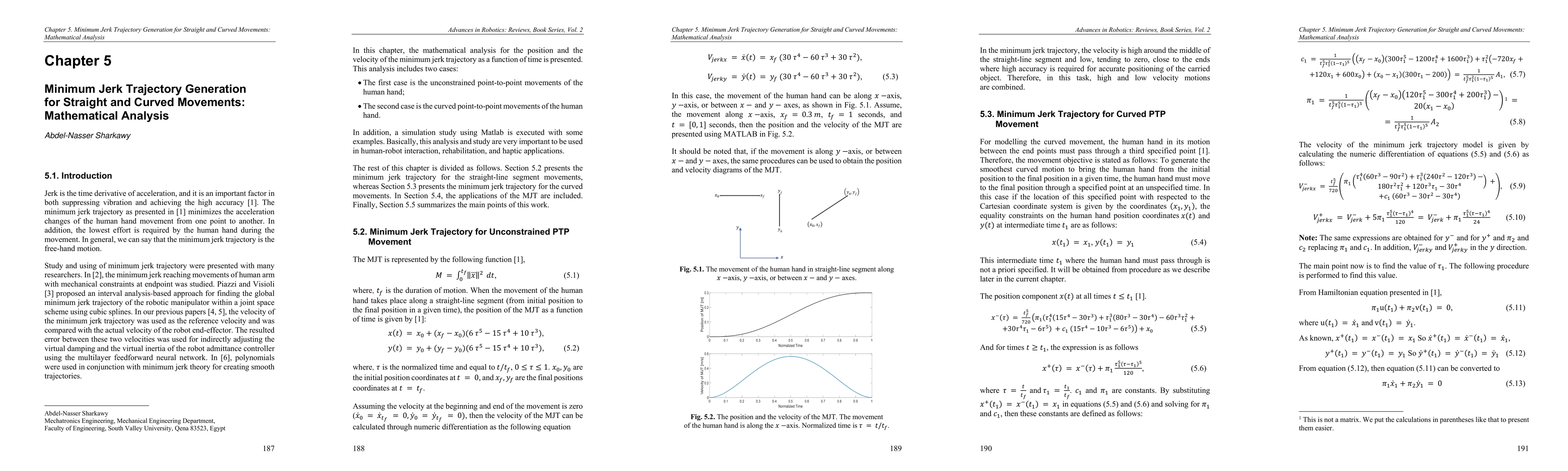 In this chapter, the mathematical analysis of the minimum jerk trajectory (MJT) generation is performed. In this study, the position and the velocity of the minimum jerk trajectory as a function of time is presented in two cases: the first one is the unconstrained point-to-point movements of the human hand, whereas the second case is the curved point-to-point movements of the human hand. Simulation study is carried out with some examples and MATLAB is used for this simulation. The results prove that the minimum jerk trajectory is the smoothest possible movement of the human hand.