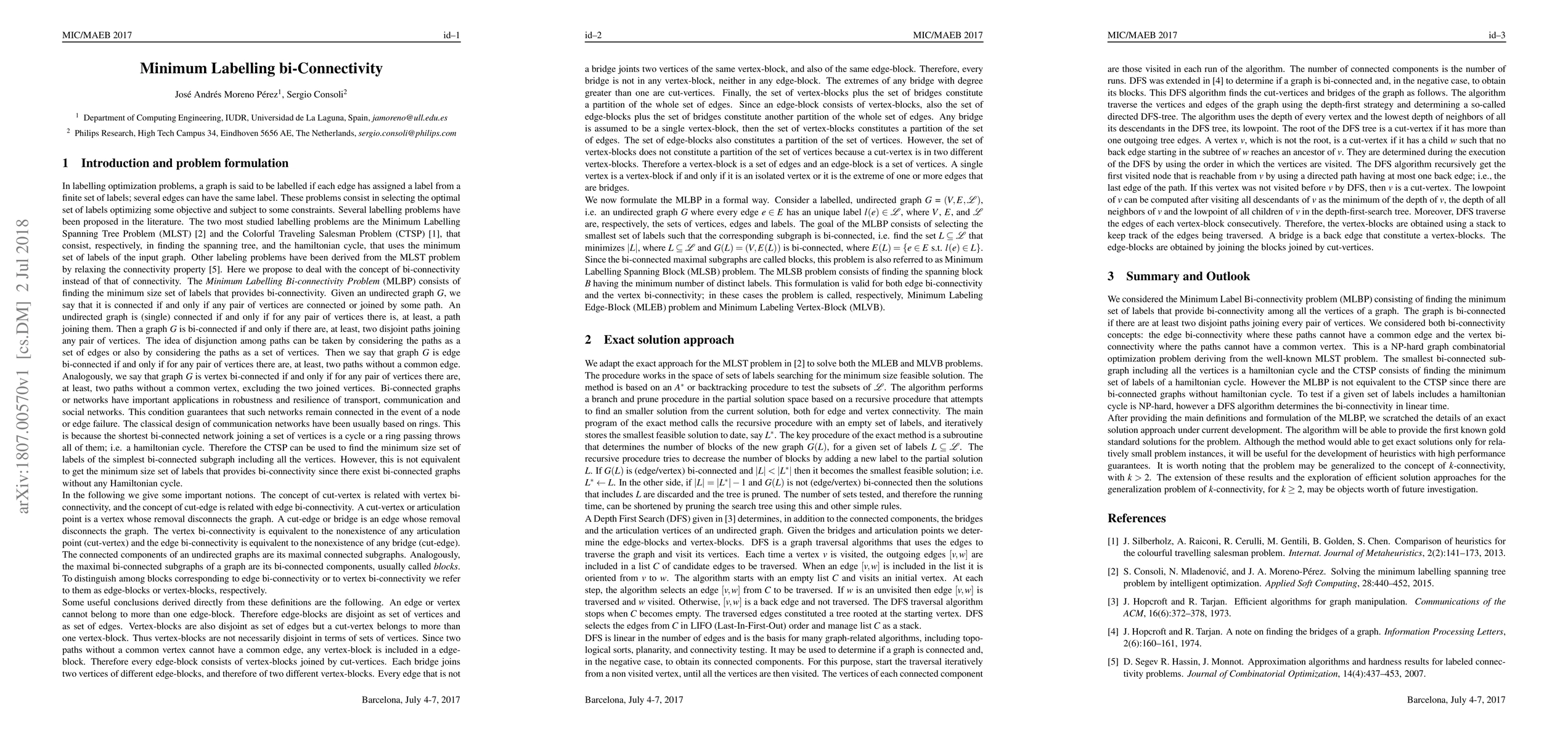 This paper investigates the minimum labelling bi-connectivity problem in labelled graphs, focusing on finding the smallest set of labels that ensure bi-connectivity, either through edge or vertex bi-connectivity. The study outlines preliminary findings and ongoing solution approaches for this NP-hard combinatorial problem.