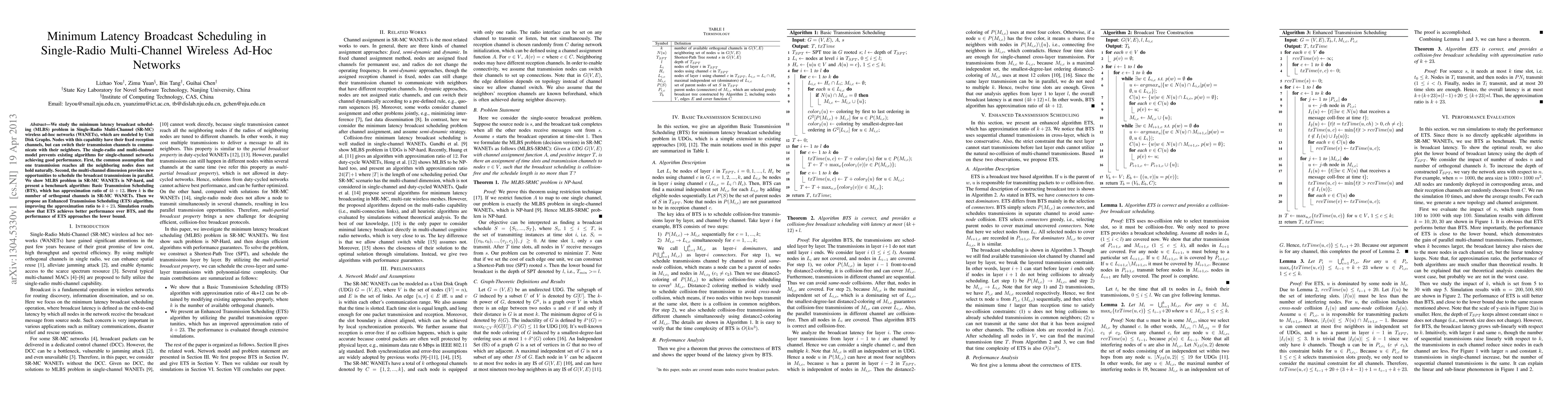 This paper addresses the minimum latency broadcast scheduling problem in Single-Radio Multi-Channel wireless ad-hoc networks, proving it NP-hard. It introduces two algorithms: Basic Transmission Scheduling (BTS) with an approximation ratio of 4k + 12, and Enhanced Transmission Scheduling (ETS) with an improved ratio of k + 23, demonstrating ETS's superior performance in simulations.