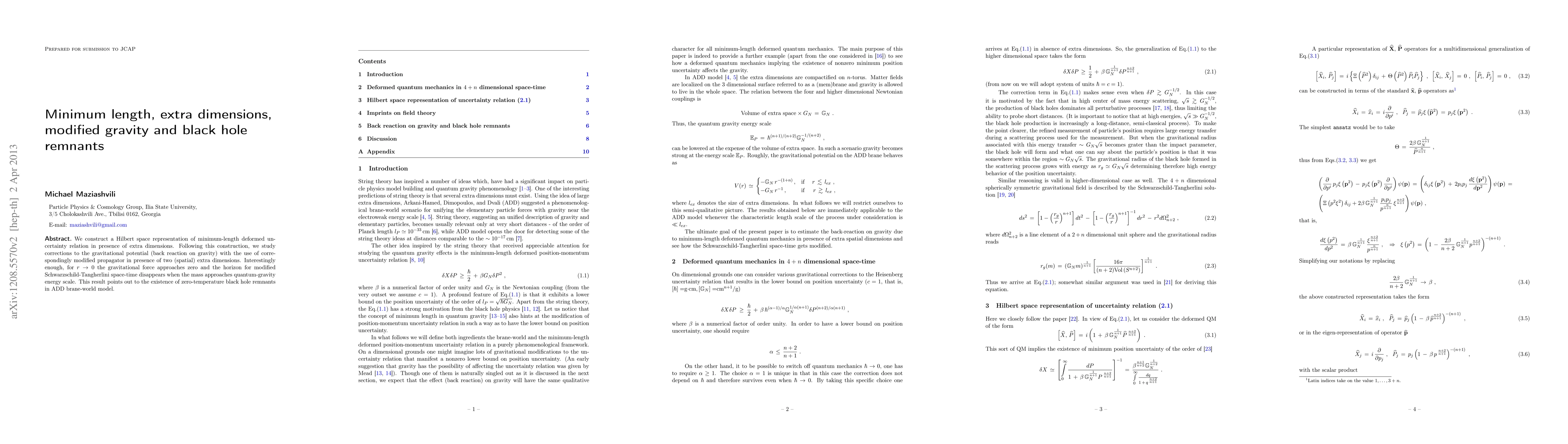 We construct a Hilbert space representation of minimum-length deformed uncertainty relation in presence of extra dimensions. Following this construction, we study corrections to the gravitational potential (back reaction on gravity) with the use of correspondingly modified propagator in presence of two (spatial) extra dimensions. Interestingly enough, for $r \rightarrow 0$ the gravitational force approaches zero and the horizon for modified Schwarzschild-Tangherlini space-time disappears when the mass approaches quantum-gravity energy scale. This result points out to the existence of zero-temperature black hole remnants in ADD brane-world model.