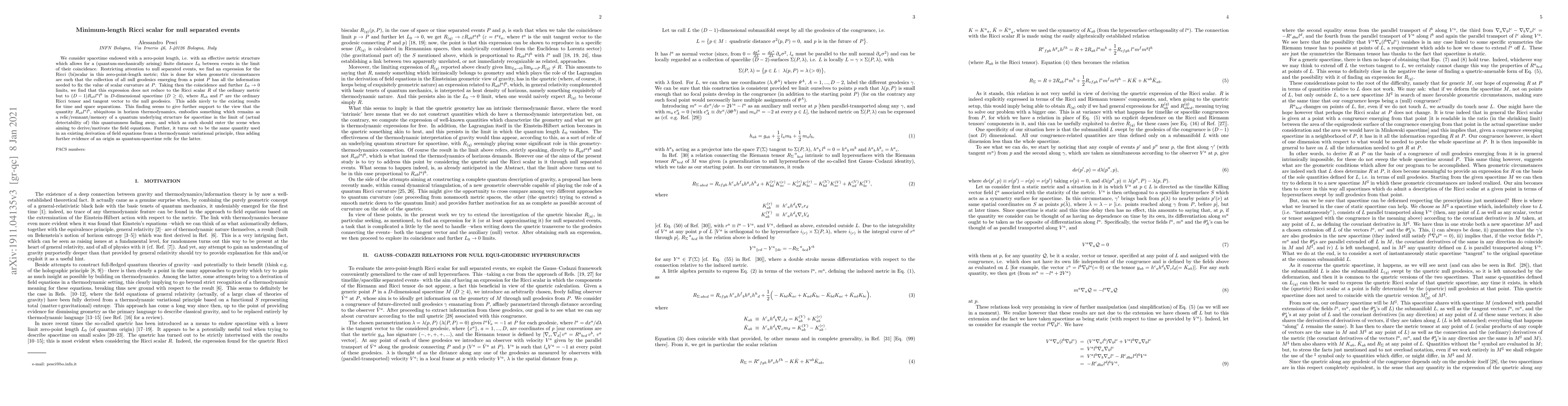 We consider spacetime endowed with a zero-point length, i.e. with an effective metric structure which allows for a (quantum-mechanically arising) finite distance $L_0$ between events in the limit of their coincidence. Restricting attention to null separated events, we find an expression for the Ricci (bi)scalar in this zero-point-length metric; this is done for when geometric circumstances are such that the collection of all null geodesics emerging from a point $P$ has all the information needed to fix the value of scalar curvature at $P$. Taking then the coincidence and further $L_0 \to 0$ limits, we find that this expression does not reduce to the Ricci scalar $R$ of the ordinary metric but to $(D-1) R_{ab} l^a l^b$ in $D$-dimensional spacetime ($D \ge 4$), where $R_{ab}$ and $l^a$ are the ordinary Ricci tensor and tangent vector to the null geodesics. This adds nicely to the existing results for time and space separations. This finding seems to give further support to the view that the quantity $R_{ab} l^a l^b$, ubiquitous in horizon thermodynamics, embodies something which remains as a relic/remnant/memory of a quantum underlying structure for spacetime in the limit of (actual detectability of) this quantumness fading away, and which as such should enter the scene when aiming to derive/motivate the field equations. Further, it turns out to be the same quantity used in an existing derivation of field equations from a thermodynamic variational principle, thus adding further evidence of an origin as quantum-spacetime relic for the latter.