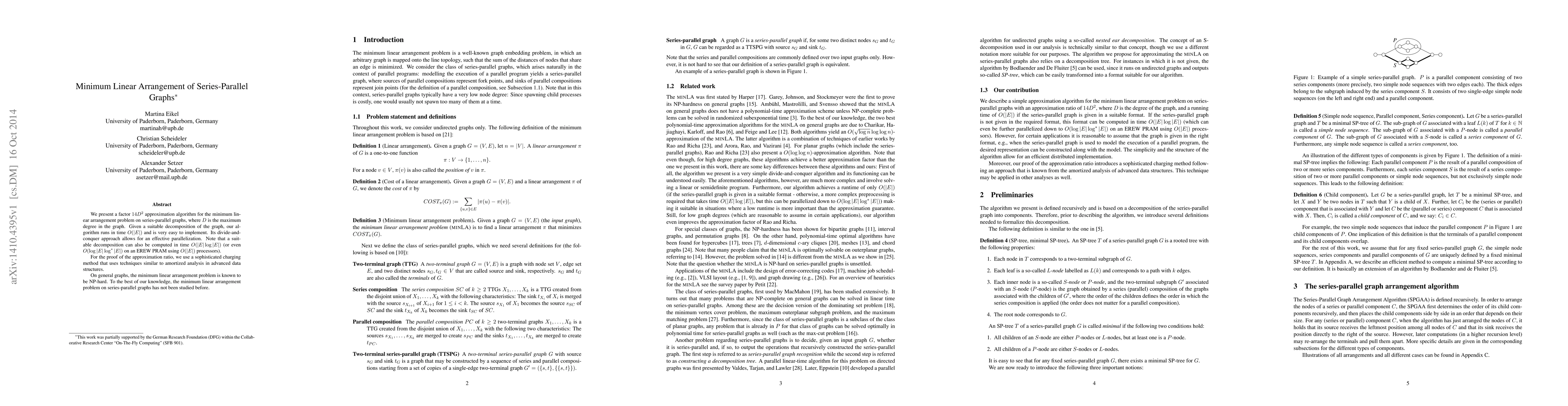 This paper presents a $14D^2$ approximation algorithm for the minimum linear arrangement problem on series-parallel graphs, running in $O(|E|)$ time with a straightforward divide-and-conquer approach amenable to parallelization. The approximation ratio is proven using a sophisticated charging method.