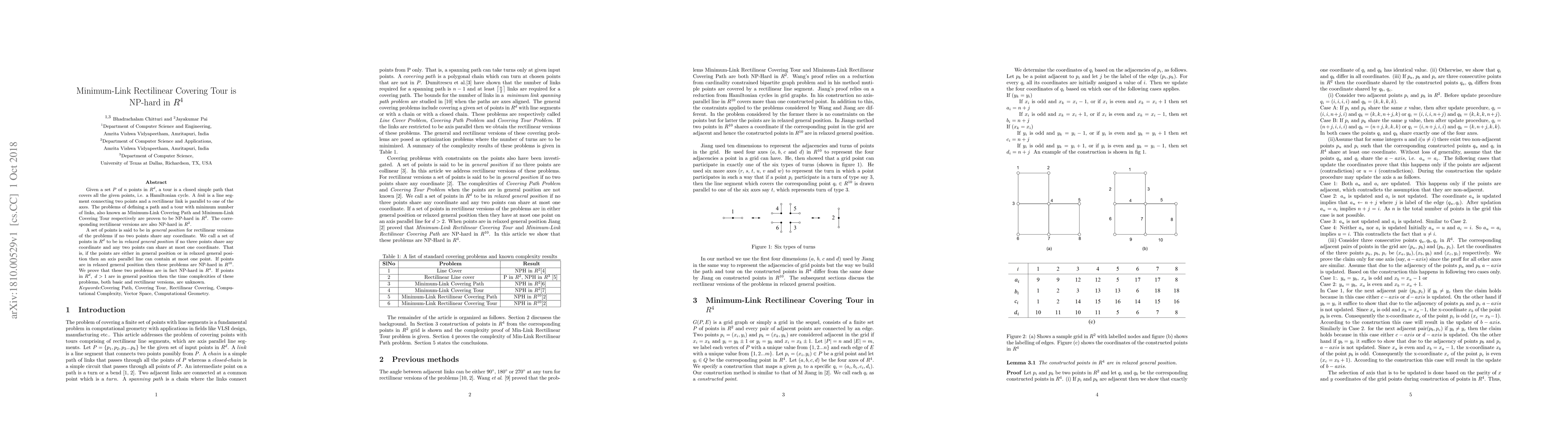 Given a set $P$ of $n$ points in $R^{d}$, a tour is a closed simple path that covers all the given points, i.e. a Hamiltonian cycle. % In $P$ if no three points are collinear then the points are said to be in general position. A \textit{link} is a line segment connecting two points and a rectilinear link is parallel to one of the axes. The problems of defining a path and a tour with minimum number of links, also known as Minimum-Link Covering Path and Minimum-Link Covering Tour respectively are proven to be NP-hard in $R^2$. The corresponding rectilinear versions are also NP-hard in $R^2$. A set of points is said to be in \textit{general position} for rectilinear versions of the problems if no two points share any coordinate. We call a set of points in $R^{d}$ to be in \textit{relaxed general position} if no three points share any coordinate and any two points can share at most one coordinate. That is, if the points are either in general position or in relaxed general position then an axis parallel line can contain at most one point. If points are in relaxed general position then these problems are NP-hard in $R^{10}$. We prove that these two problems are in fact NP-hard in $R^{4}$. If points in $R^{d},~d>1$ are in general position then the time complexities of these problems, both basic and rectilinear versions, are unknown.