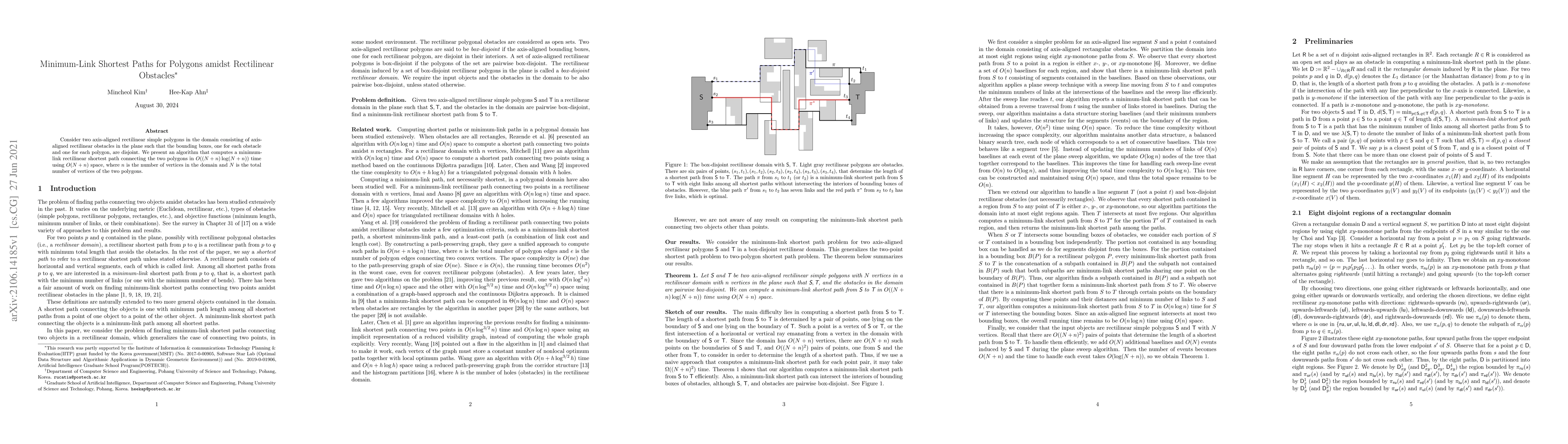 Summary: This paper proposes an efficient algorithm to find the minimum-link rectilinear shortest path between two simple polygons amidst axis-aligned rectilinear obstacles, achieving a computational time of $O((N+n)\log (N+n))$ and using $O(N+n)$ space, where $N$ and $n$ are the total vertices of the polygons and the domain, respectively.