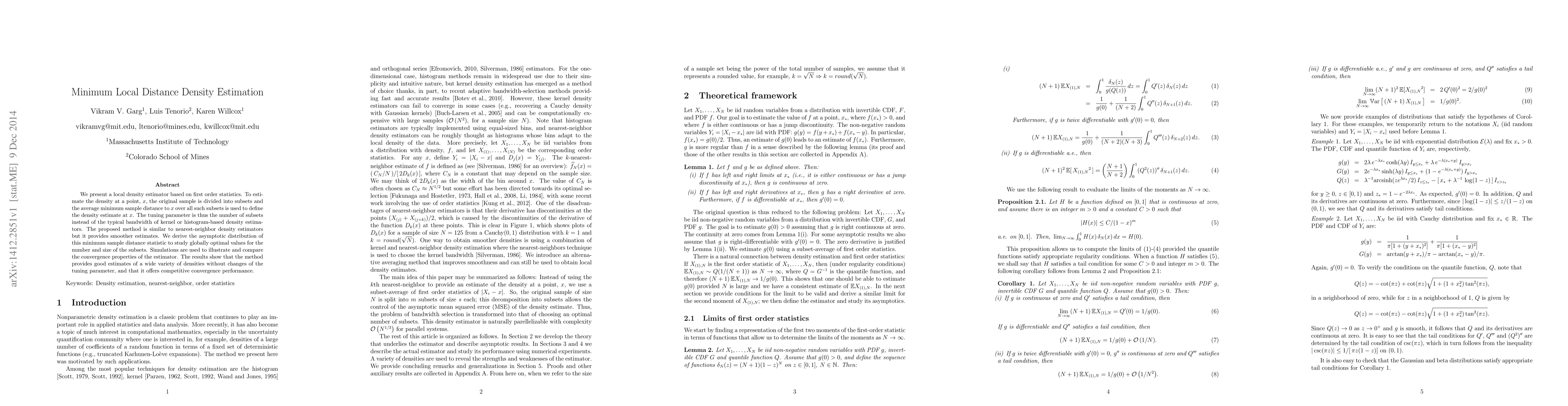 We present a local density estimator based on first order statistics. To estimate the density at a point, $x$, the original sample is divided into subsets and the average minimum sample distance to $x$ over all such subsets is used to define the density estimate at $x$. The tuning parameter is thus the number of subsets instead of the typical bandwidth of kernel or histogram-based density estimators. The proposed method is similar to nearest-neighbor density estimators but it provides smoother estimates. We derive the asymptotic distribution of this minimum sample distance statistic to study globally optimal values for the number and size of the subsets. Simulations are used to illustrate and compare the convergence properties of the estimator. The results show that the method provides good estimates of a wide variety of densities without changes of the tuning parameter, and that it offers competitive convergence performance.