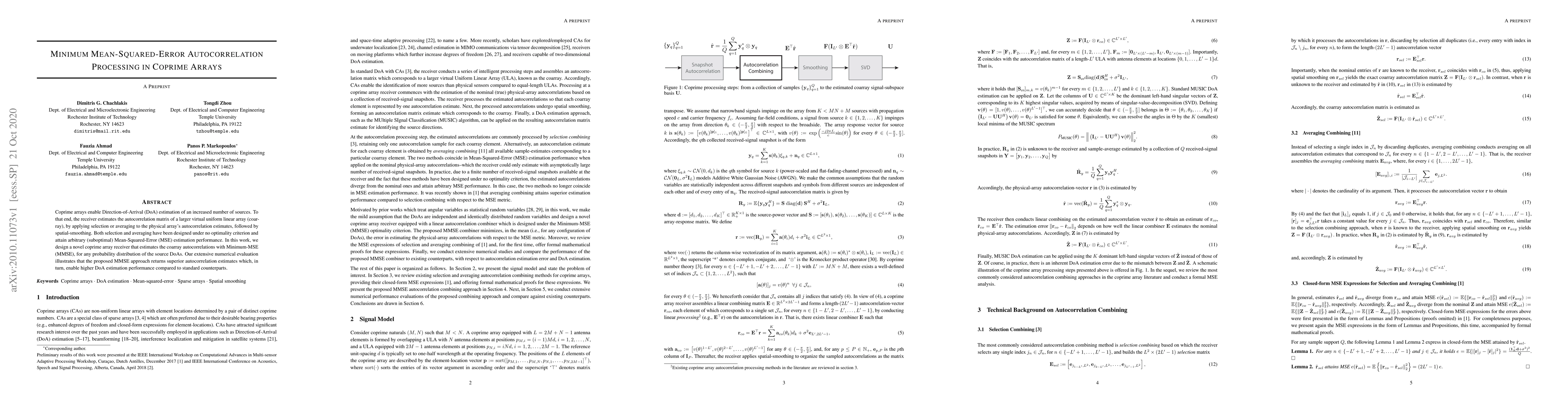This paper proposes a novel Minimum Mean-Squared-Error (MMSE) receiver for coprime arrays to enhance Direction-of-Arrival (DoA) estimation. The MMSE approach optimizes the autocorrelation estimates, leading to superior performance compared to suboptimal selection and averaging methods.
