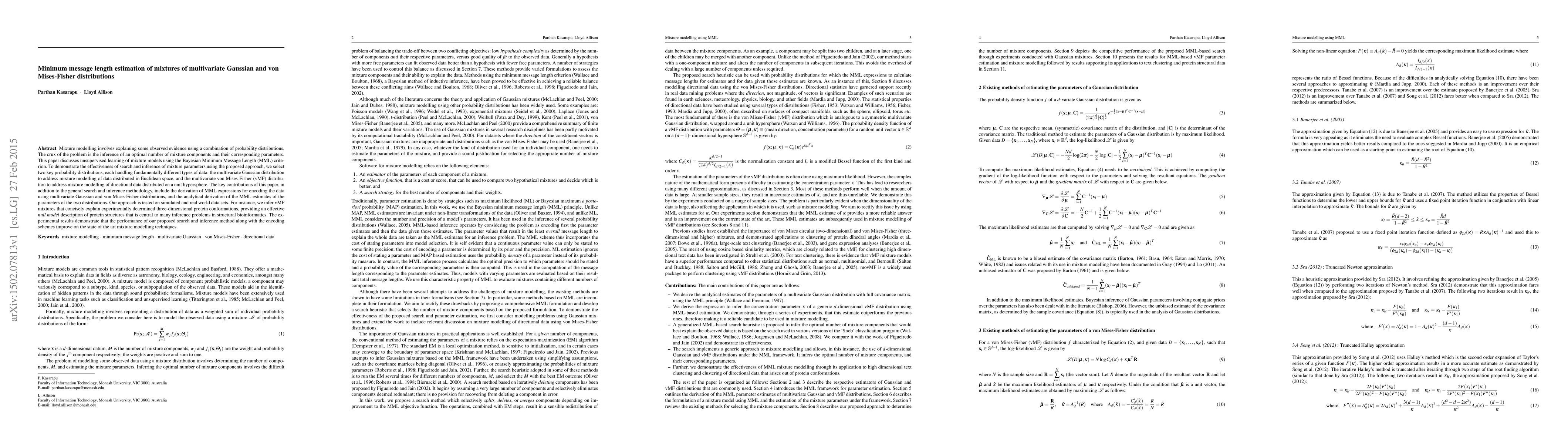 This paper proposes an unsupervised learning method for mixture models using the Bayesian Minimum Message Length (MML) criterion, focusing on the estimation of mixtures of multivariate Gaussian and von Mises-Fisher distributions. It introduces MML expressions for encoding data with these distributions and demonstrates its effectiveness on both simulated and real datasets, including protein conformations in structural bioinformatics.