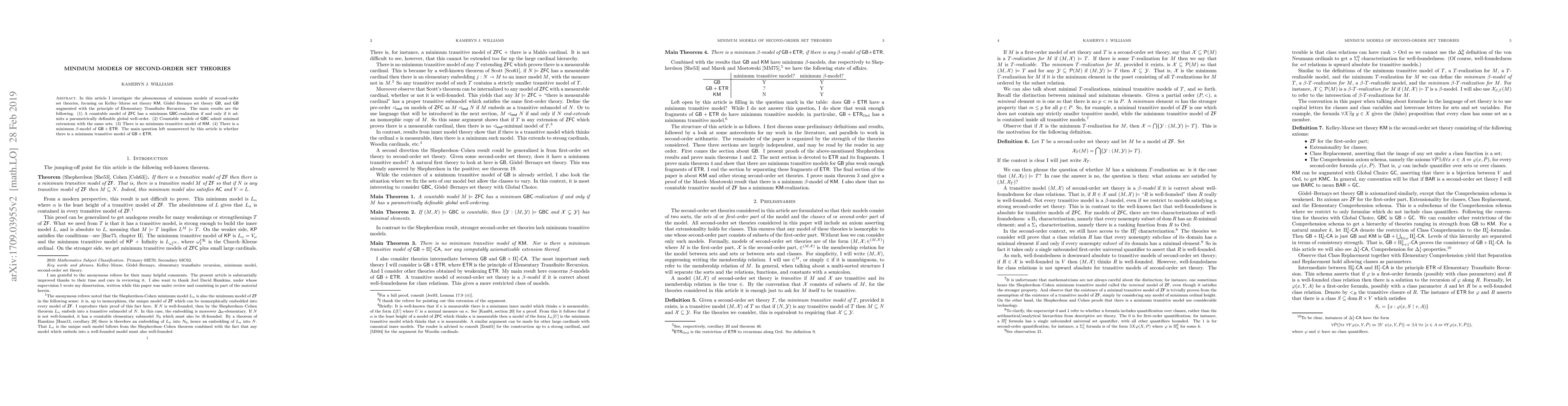 This paper explores minimum models of second-order set theories, specifically $\mathsf{KM}$, $\mathsf{GB}$, and $\mathsf{GB}$ with Elementary Transfinite Recursion. It finds that countable models of $\mathsf{ZFC}$ with a parametric global well-order have minimum $\mathsf{GBC}$ realizations, countable $\mathsf{GBC}$ models admit minimal extensions, $\mathsf{KM}$ has no minimum transitive model, and $\mathsf{GB} + \mathsf{ETR}$ has a minimum $\beta$-model. The study leaves open whether $\mathsf{GB} + \mathsf{ETR}$ has a minimum transitive model.