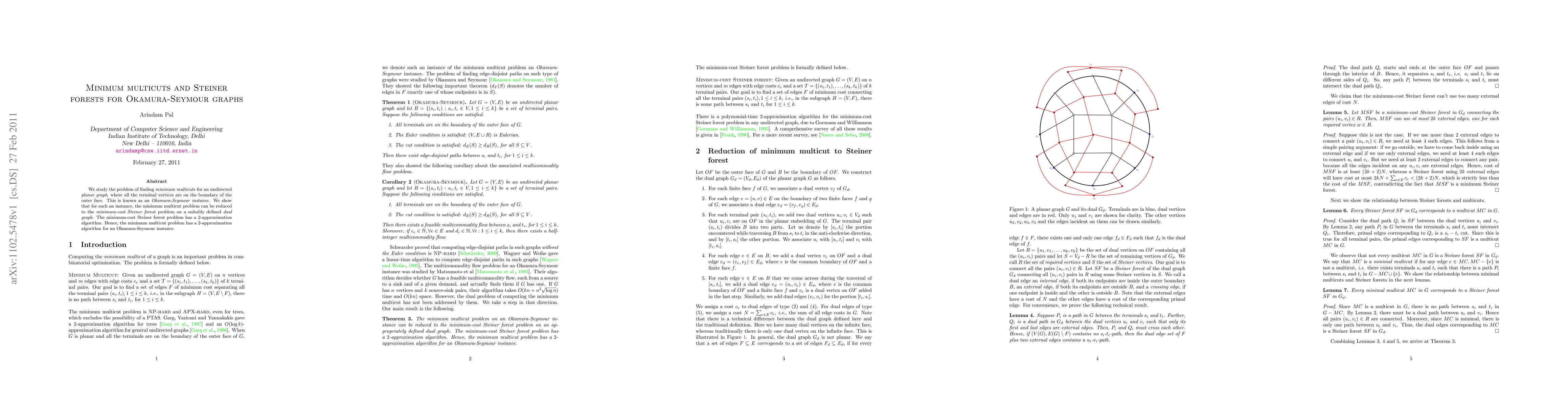 This paper addresses the minimum multicut problem for Okamura-Seymour instances in planar graphs, demonstrating its reduction to the minimum-cost Steiner forest problem on a dual graph. It concludes with a 2-approximation algorithm for the minimum multicut problem.