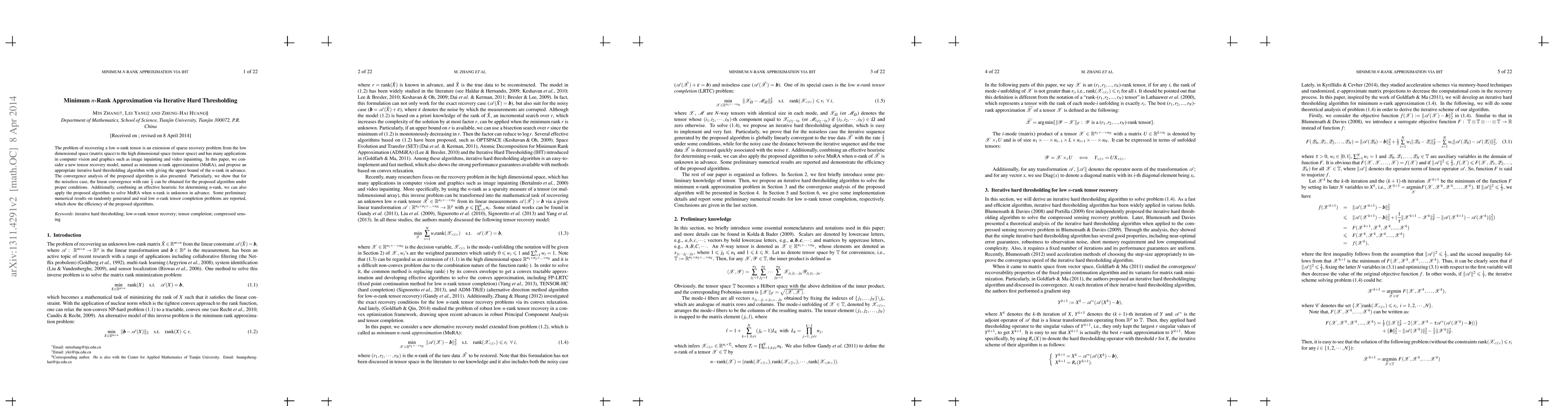 This paper proposes an iterative hard thresholding algorithm for minimum $n$-rank approximation (MnRA) to recover low $n$-rank tensors, extending sparse recovery techniques to high-dimensional tensor spaces. The algorithm converges linearly under certain conditions, and preliminary numerical results show its efficiency in tensor completion tasks.