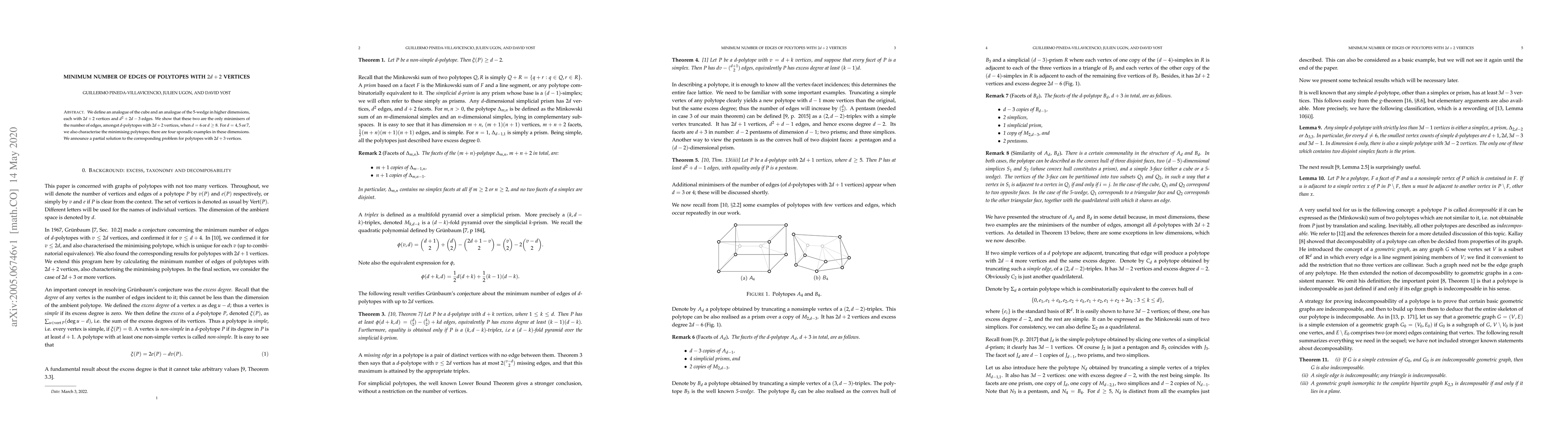 We define an analogue of the cube and an analogue of the 5-wedge in higher dimensions, each with $2d+2$ vertices and $d^2+2d-3$ edges. We show that these two are the only minimisers of the number of edges, amongst d-polytopes with $2d+2$ vertices, for all $d$ except 4, 5 and 7. We also show that there are four sporadic minimisers in these low dimensions. We announce a partial solution to the corresponding problem for polytopes with $2d + 3$ vertices.