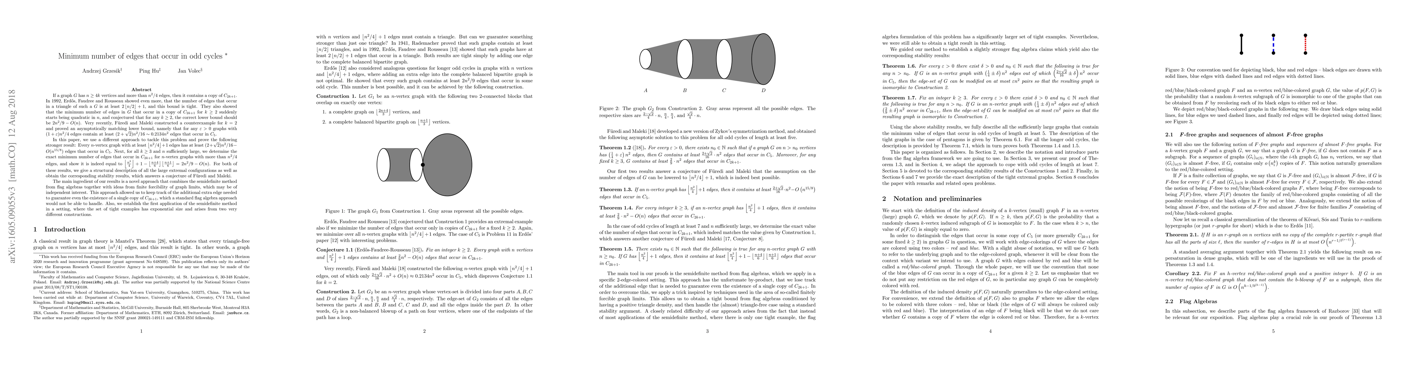 If a graph has $n\ge4k$ vertices and more than $n^2/4$ edges, then it contains a copy of $C_{2k+1}$. In 1992, Erd\H{o}s, Faudree and Rousseau showed even more, that the number of edges that occur in a triangle is at least $2\lfloor n/2\rfloor+1$, and this bound is tight. They also showed that the minimum number of edges that occur in a $C_{2k+1}$ for $k\ge2$ is at least $11n^2/144-O(n)$, and conjectured that for any $k\ge2$, the correct lower bound should be $2n^2/9-O(n)$. Very recently, F\"uredi and Maleki constructed a counterexample for $k=2$ and proved asymptotically matching lower bound, namely that for any $\varepsilon>0$ graphs with $(1+\varepsilon)n^2/4$ edges contain at least $(2+\sqrt{2})n^2/16 \approx 0.2134n^2$ edges that occur in $C_5$. In this paper, we use a different approach to tackle this problem and obtain the following stronger result: Any $n$-vertex graph with at least $\lfloor n^2/4\rfloor+1$ edges has at least $(2+\sqrt{2})n^2/16-O(n^{15/8})$ edges that occur in $C_5$. Next, for all $k\ge 3$ and $n$ sufficiently large, we determine the exact minimum number of edges that occur in $C_{2k+1}$ for $n$-vertex graphs with more than $n^2/4$ edges, and show it is indeed equal to $\lfloor\frac{n^2}4\rfloor+1-\lfloor\frac{n+4}6\rfloor\lfloor\frac{n+1}6\rfloor=2n^2/9-O(n)$. For both results, we give a structural description of the extremal configurations as well as obtain the corresponding stability results, which answer a conjecture of F\"uredi and Maleki. The main ingredient is a novel approach that combines the flag algebras together with ideas from finite forcibility of graph limits. This approach allowed us to keep track of the extra edge needed to guarantee an existence of a $C_{2k+1}$. Also, we establish the first application of semidefinite method in a setting, where the set of tight examples has exponential size, and arises from different constructions.