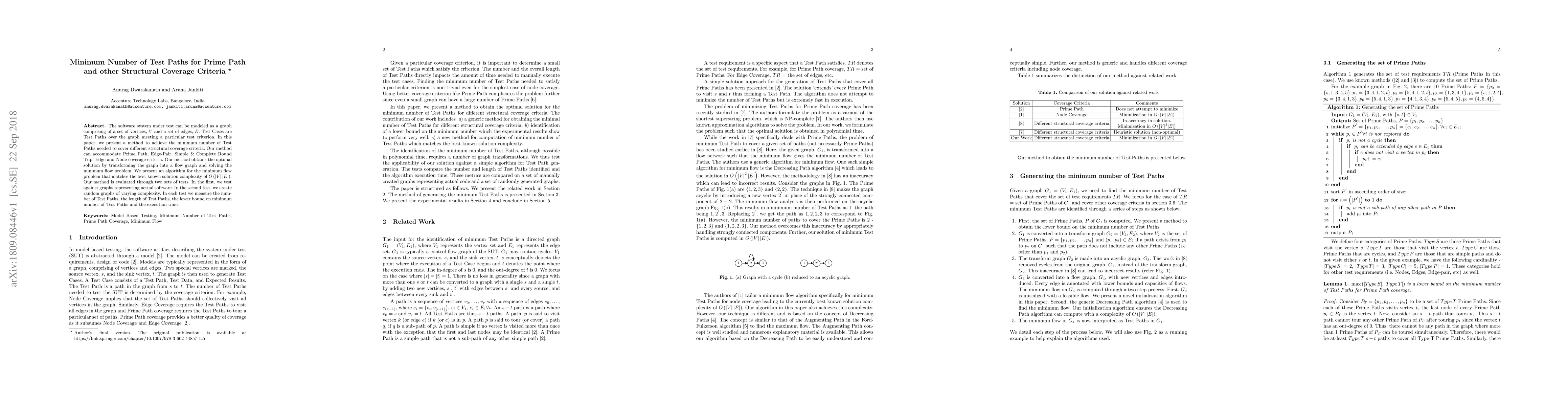 The paper presents a method to minimize test paths for various structural coverage criteria in software testing, using a flow graph and solving the minimum flow problem, resulting in optimal solutions with minimal execution time.