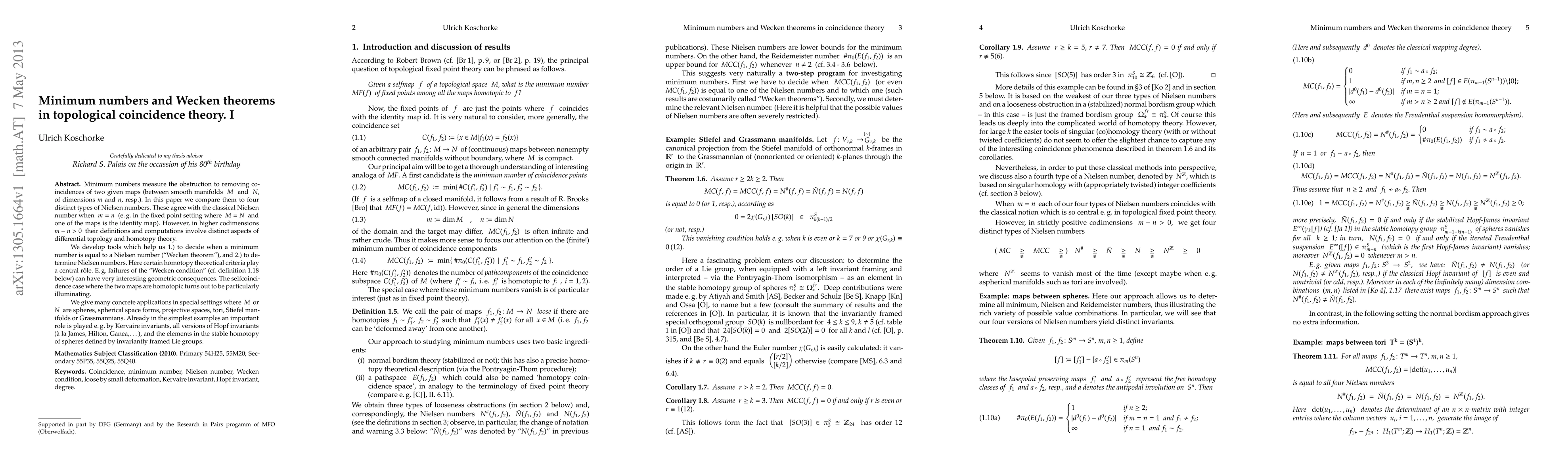 Minimum numbers measure the obstruction to removing coincidences of two given maps (between smooth manifolds M and N of dimensions m and n, resp.). In this paper we compare them to four distinct types of Nielsen numbers. These agree with the classical Nielsen number when m = n (e.g. in the fixed point setting where M = N and one of the maps is the identity map). However, in higher codimensions m - n > 0 their definitions and computations involve distinct aspects of differential topology and homotopy theory. We develop tools which help us 1.) to decide when a minimum number is equal to a Nielsen number ("Wecken theorem"), and 2.) to determine Nielsen numbers. Here certain homotopy theoretical criteria play a central role. E.g. failures of the "Wecken condition" (cf. definition 1.18 below) can have very interesting geometric consequences. The selfcoincidence case where the two maps are homotopic turns out to be particularly illuminating. We give many concrete applications in special settings where M or N are spheres, spherical space forms, projective spaces, tori, Stiefel manifolds or Grassmannians. Already in the simplest examples an important role is played e.g. by Kervaire invariants, all versions of Hopf invariants (a la James, Hilton, Ganea,...) and the elements in the stable homotopy of spheres defined by invariantly framed Lie groups.