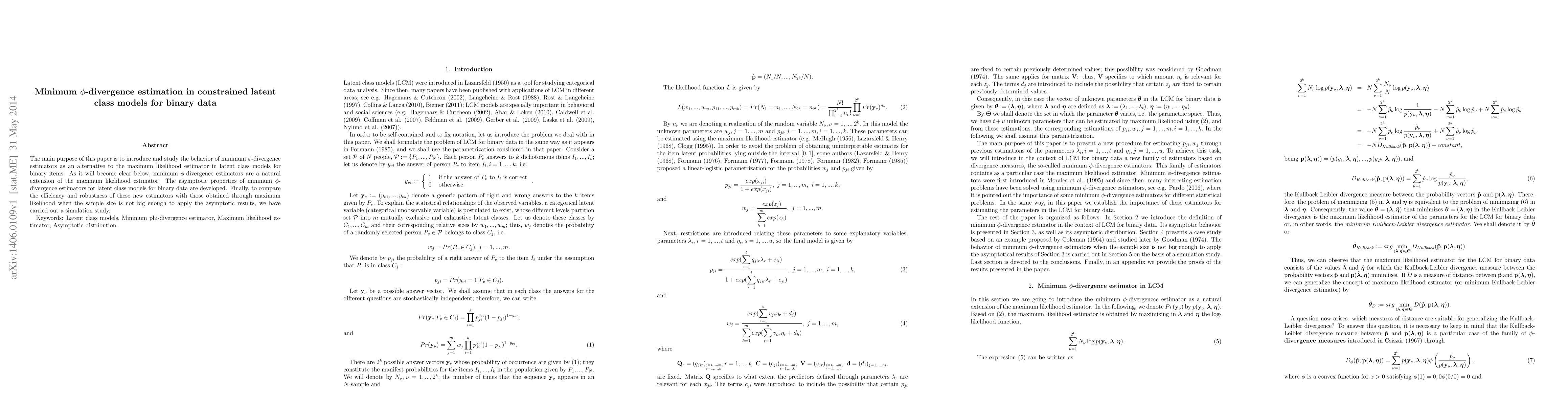 This paper introduces minimum {\phi}-divergence estimators as an alternative to maximum likelihood estimators in latent class models for binary data, developing their asymptotic properties and comparing their efficiency and robustness through a simulation study.