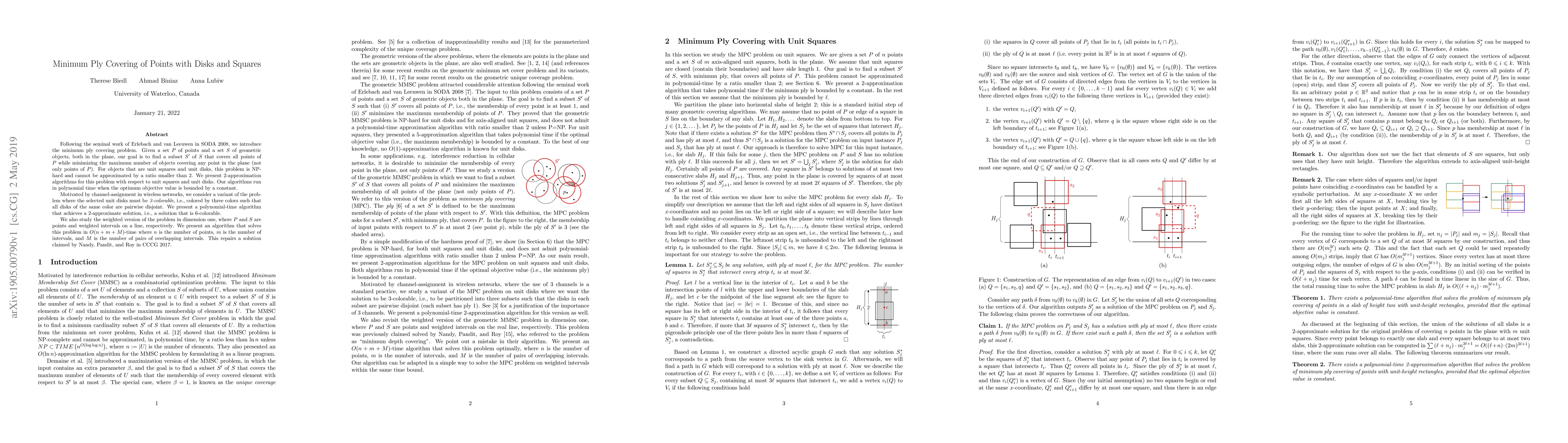 This paper introduces the minimum ply covering problem, aiming to cover a set of points using a subset of geometric objects while minimizing the maximum number of objects covering any point. It presents 2-approximation algorithms for unit squares and disks, and a 2-approximate solution for a 3-colorable disk variant. Additionally, it addresses a weighted version in one dimension, correcting a previous algorithm.