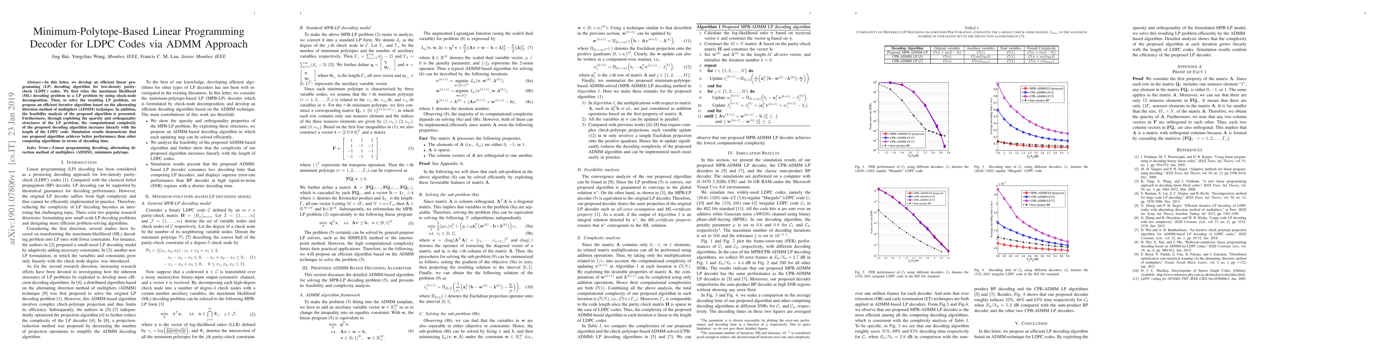 In this letter, we develop an efficient linear programming (LP) decoding algorithm for low-density parity-check (LDPC) codes. We first relax the maximum likelihood (ML) decoding problem to a LP problem by using check-node decomposition. Then, to solve the resulting LP problem, we propose an efficient iterative algorithm based on the alternating direction method of multipliers (ADMM) technique. In addition, the feasibility analysis of the proposed algorithm is presented. Furthermore, through exploiting the sparsity and orthogonality structures of the LP problem, the computational complexity of the proposed decoding algorithm increases linearly with the length of the LDPC code. Simulation results demonstrate that our proposed algorithm achieves better performance than other competing algorithms in terms of decoding time.