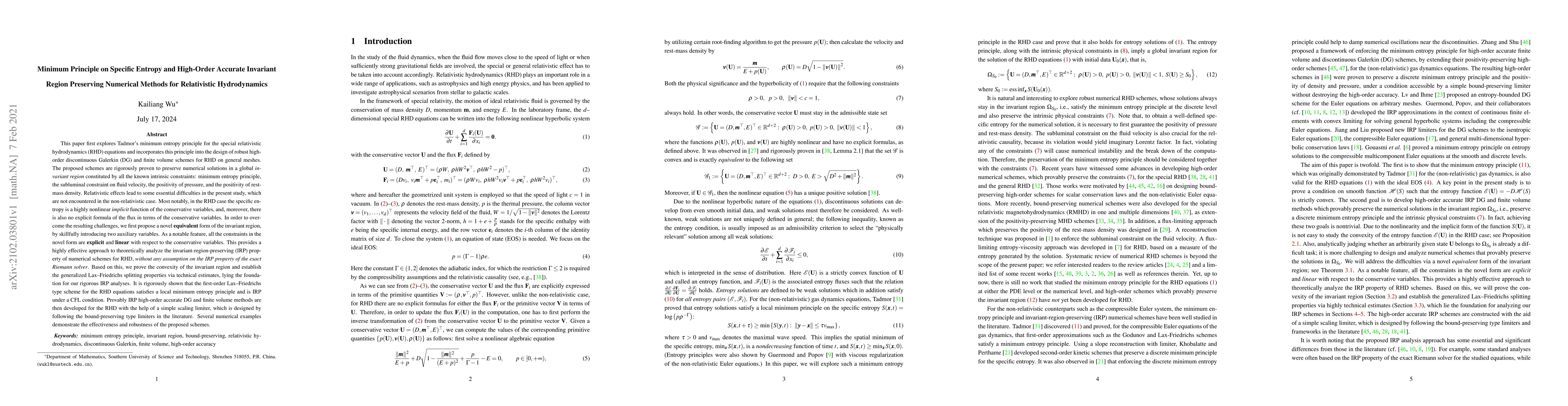 This paper develops new numerical methods for relativistic hydrodynamics that preserve the minimum principle on specific entropy and maintain a global invariant region, ensuring accurate and stable solutions.