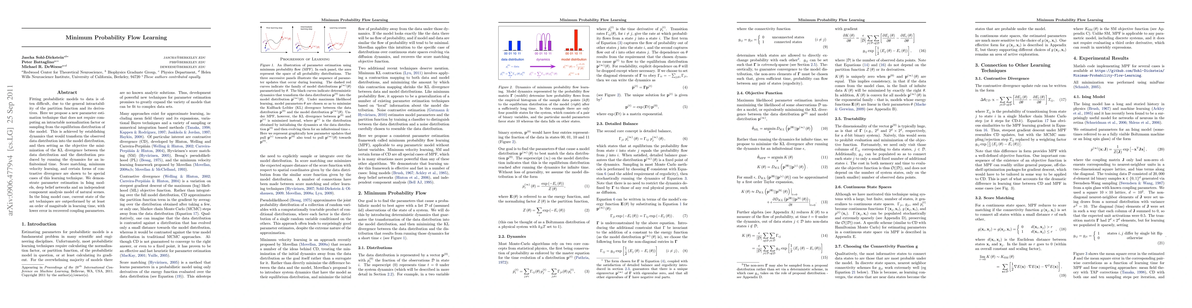 Fitting probabilistic models to data is often difficult, due to the general intractability of the partition function and its derivatives. Here we propose a new parameter estimation technique that does not require computing an intractable normalization factor or sampling from the equilibrium distribution of the model. This is achieved by establishing dynamics that would transform the observed data distribution into the model distribution, and then setting as the objective the minimization of the KL divergence between the data distribution and the distribution produced by running the dynamics for an infinitesimal time. Score matching, minimum velocity learning, and certain forms of contrastive divergence are shown to be special cases of this learning technique. We demonstrate parameter estimation in Ising models, deep belief networks and an independent component analysis model of natural scenes. In the Ising model case, current state of the art techniques are outperformed by at least an order of magnitude in learning time, with lower error in recovered coupling parameters.