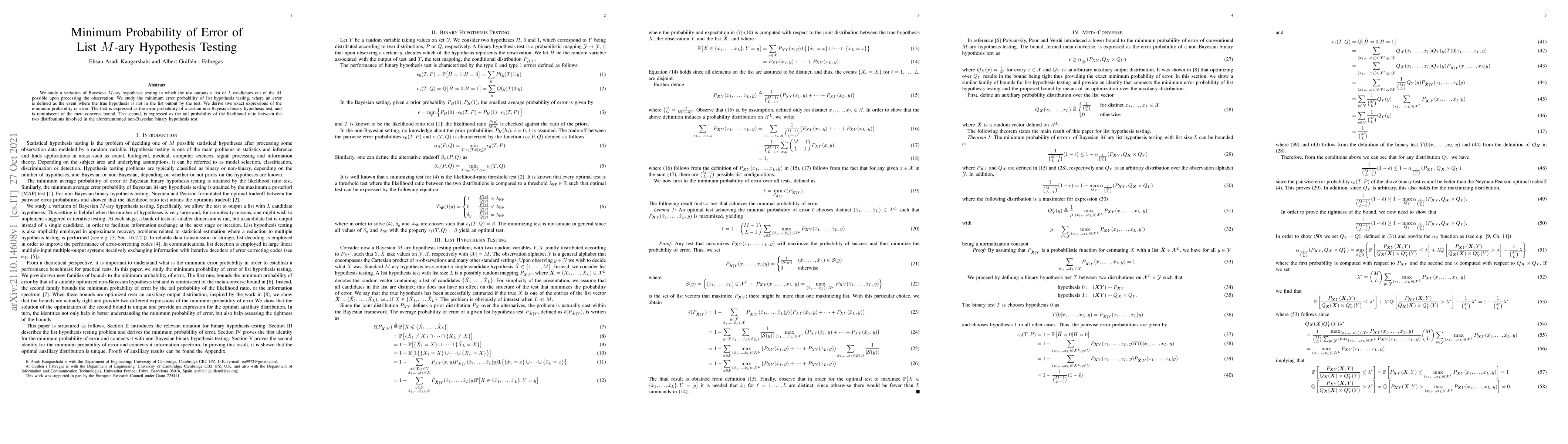 This paper investigates the minimum error probability in list M-ary hypothesis testing, where a test outputs a list of L candidates from M possibilities. It derives two exact expressions for the minimum error probability, one linked to a non-Bayesian binary hypothesis test and the other as a tail probability of the likelihood ratio.