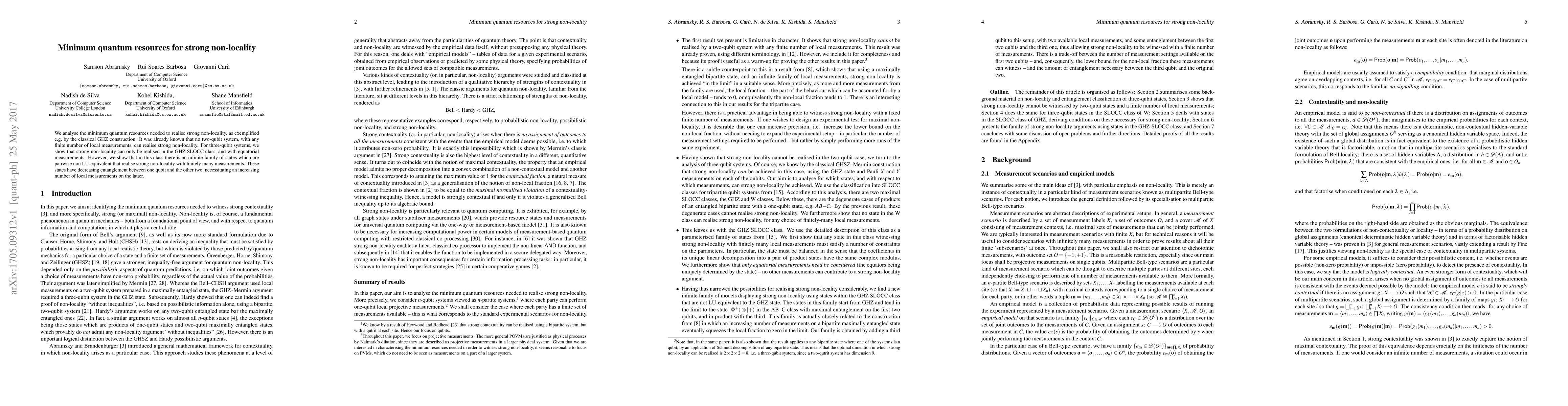 We analyse the minimum quantum resources needed to realise strong non-locality, as exemplified e.g. by the classical GHZ construction. It was already known that no two-qubit system, with any finite number of local measurements, can realise strong non-locality. For three-qubit systems, we show that strong non-locality can only be realised in the GHZ SLOCC class, and with equatorial measurements. However, we show that in this class there is an infinite family of states which are pairwise non-LU-equivalent that realise strong non-locality with finitely many measurements. These states have decreasing entanglement between one qubit and the other two, necessitating an increasing number of local measurements on the latter.