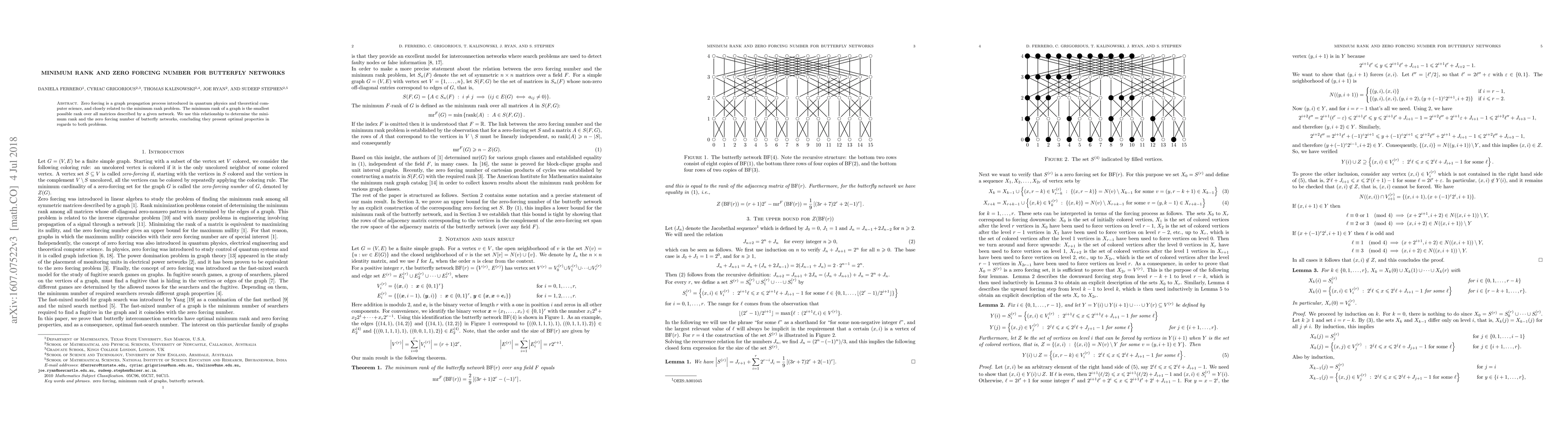 Summary: This paper determines the minimum rank of the butterfly network graph, establishing it as $\frac19\left[(3r+1)2^{r+1}-2(-1)^r\right]$ and showing this equals the rank of its adjacency matrix, leveraging the zero forcing number.