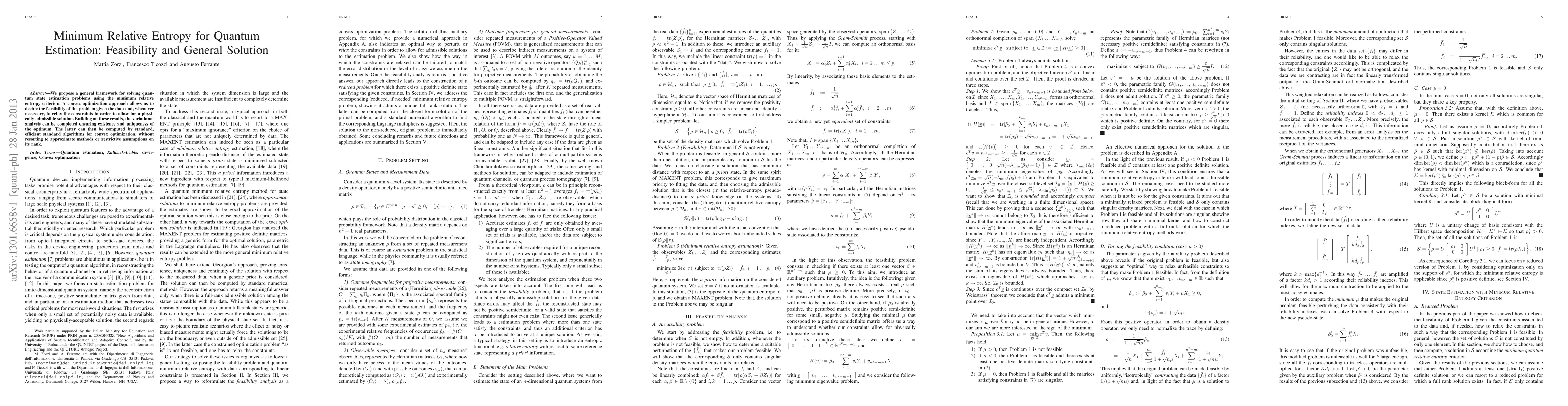 This paper presents a general framework for solving quantum state estimation problems using minimum relative entropy, allowing for feasible solutions with convex optimization and efficient computation of optima.