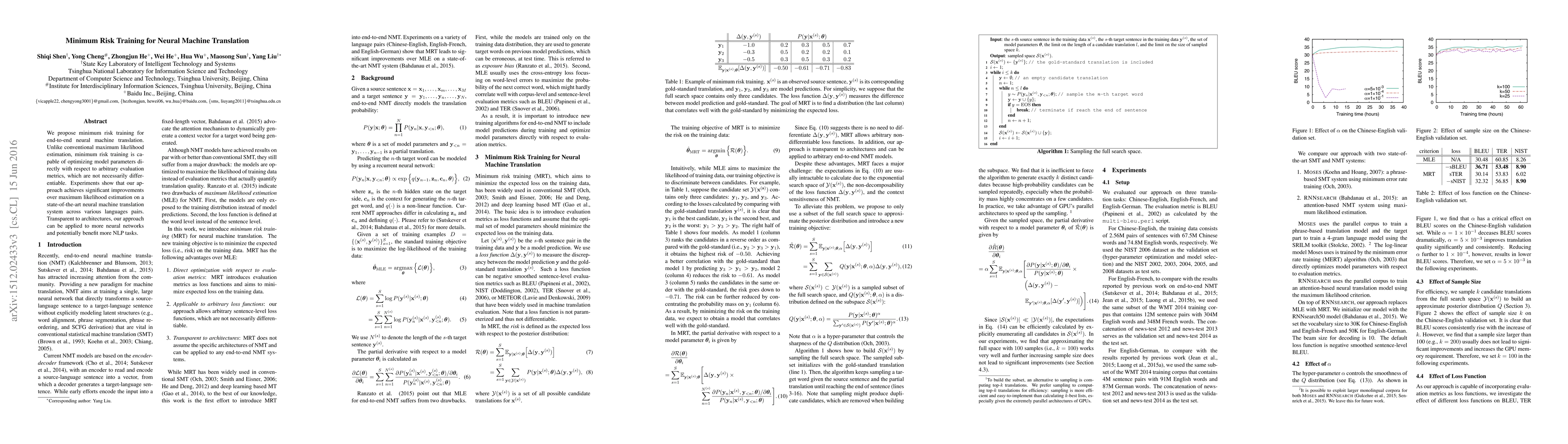 This paper proposes minimum risk training for neural machine translation, optimizing model parameters based on arbitrary evaluation metrics rather than just maximum likelihood estimation. The approach demonstrates significant improvements over traditional methods across multiple language pairs.