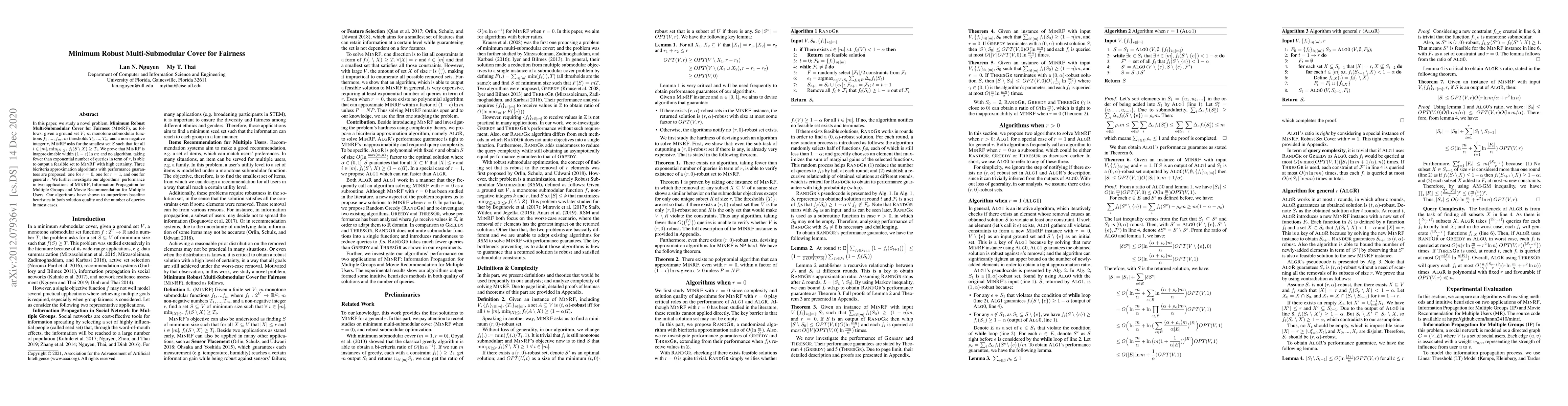 This paper introduces Minimum Robust Multi-Submodular Cover for Fairness, a problem that asks for the smallest set to ensure fairness for multiple submodular functions. The authors propose algorithms with performance guarantees to solve this problem efficiently.