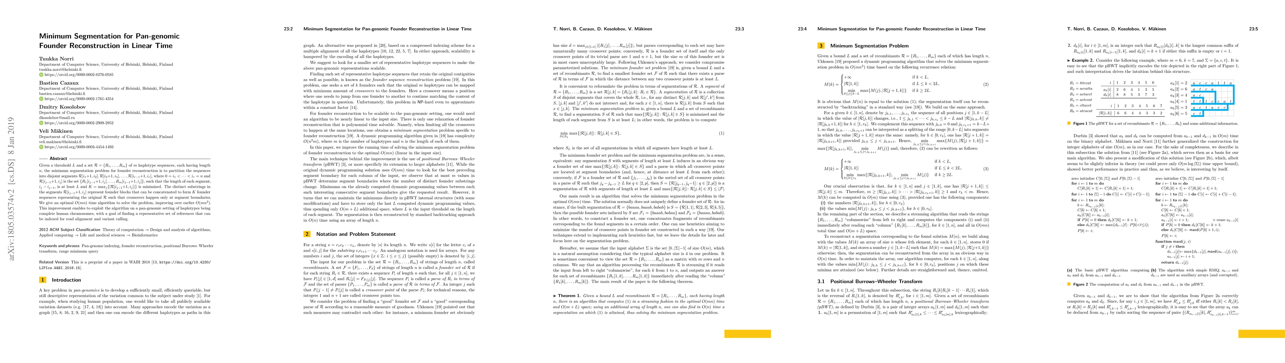 Given a threshold $L$ and a set $\mathcal{R} = \{R_1, \ldots, R_m\}$ of $m$ haplotype sequences, each having length $n$, the minimum segmentation problem for founder reconstruction is to partition the sequences into disjoint segments $\mathcal{R}[i_1{+}1,i_2], \mathcal{R}[i_2{+}1, i_3], \ldots, \mathcal{R}[i_{r-1}{+}1, i_r]$, where $0 = i_1 < \cdots < i_r = n$ and $\mathcal{R}[i_{j-1}{+}1, i_j]$ is the set $\{R_1[i_{j-1}{+}1, i_j], \ldots, R_m[i_{j-1}{+}1, i_j]\}$, such that the length of each segment, $i_j - i_{j-1}$, is at least $L$ and $K = \max_j\{ |\mathcal{R}[i_{j-1}{+}1, i_j]| \}$ is minimized. The distinct substrings in the segments $\mathcal{R}[i_{j-1}{+}1, i_j]$ represent founder blocks that can be concatenated to form $K$ founder sequences representing the original $\mathcal{R}$ such that crossovers happen only at segment boundaries. We give an optimal $O(mn)$ time algorithm to solve the problem, improving over earlier $O(mn^2)$. This improvement enables to exploit the algorithm on a pan-genomic setting of haplotypes being complete human chromosomes, with a goal of finding a representative set of references that can be indexed for read alignment and variant calling.