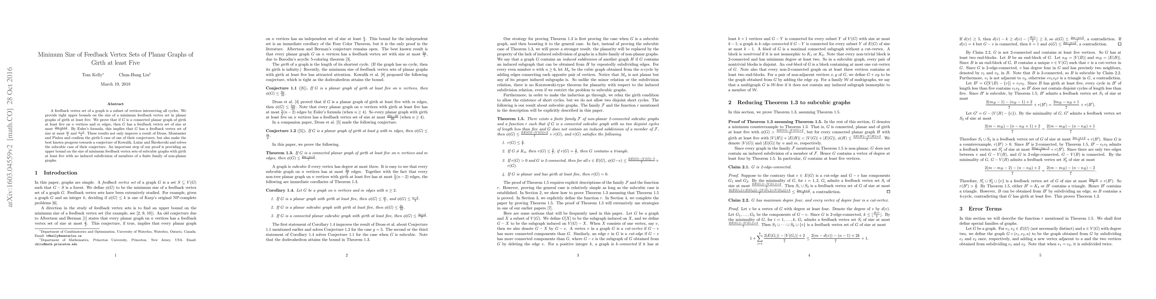 This paper establishes tight upper bounds on the size of minimum feedback vertex sets in planar graphs with girth at least five, showing that such graphs have feedback vertex sets of size at most $\frac{2m-n+2}{7}$, improving previous results and confirming conjectures related to planar graph structures.