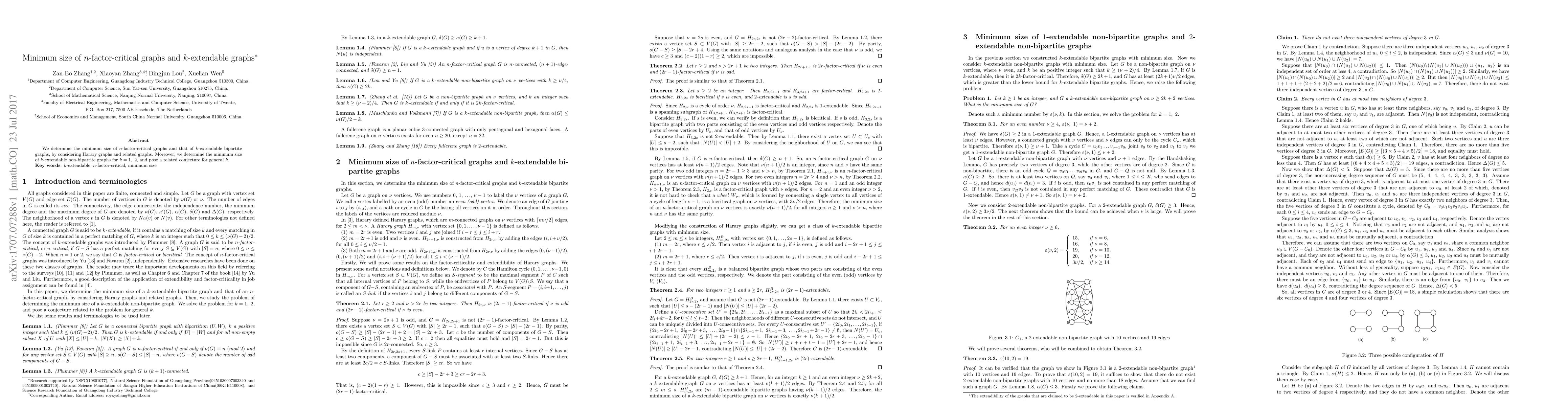 This paper finds the minimum size of $n$-factor-critical graphs and $k$-extendable bipartite graphs using Harary graphs, and determines the minimum size for $k$-extendable non-bipartite graphs when $k=1, 2$. It also proposes a conjecture for the general case of $k$.