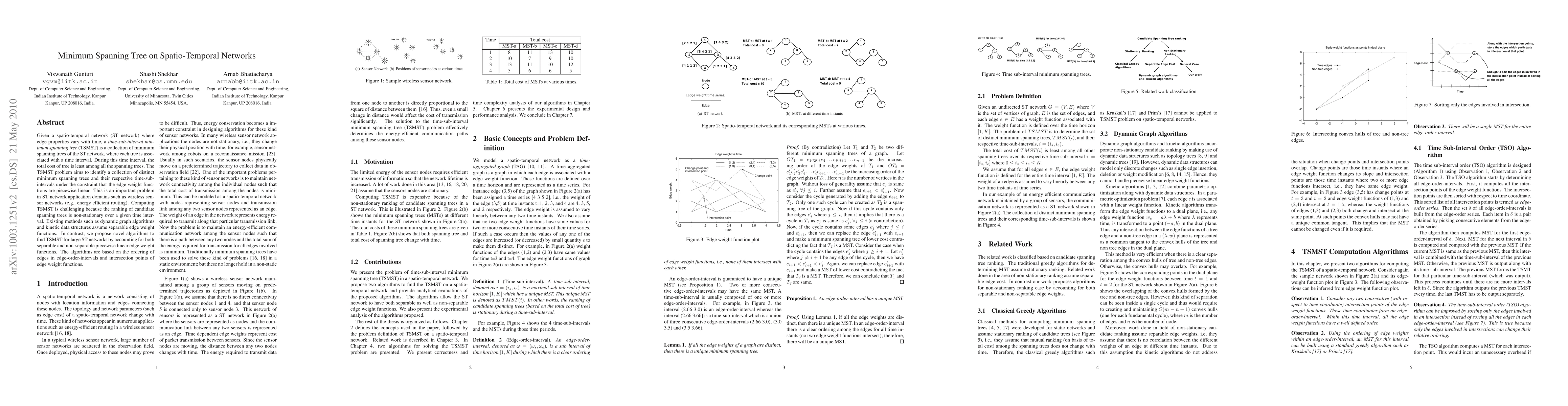 Given a spatio-temporal network (ST network) where edge properties vary with time, a time-sub-interval minimum spanning tree (TSMST) is a collection of minimum spanning trees of the ST network, where each tree is associated with a time interval. During this time interval, the total cost of tree is least among all the spanning trees. The TSMST problem aims to identify a collection of distinct minimum spanning trees and their respective time-sub-intervals under the constraint that the edge weight functions are piecewise linear. This is an important problem in ST network application domains such as wireless sensor networks (e.g., energy efficient routing). Computing TSMST is challenging because the ranking of candidate spanning trees is non-stationary over a given time interval. Existing methods such as dynamic graph algorithms and kinetic data structures assume separable edge weight functions. In contrast, we propose novel algorithms to find TSMST for large ST networks by accounting for both separable and non-separable piecewise linear edge weight functions. The algorithms are based on the ordering of edges in edge-order-intervals and intersection points of edge weight functions.