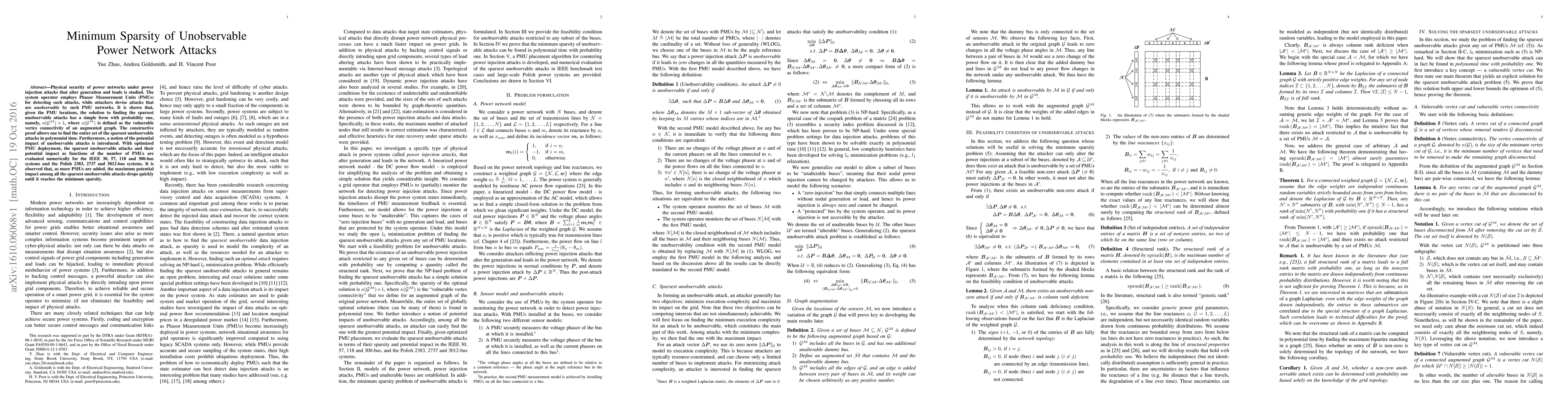 This paper investigates the minimum sparsity of undetectable power network attacks using PMUs, demonstrating that the sparsest unobservable attacks can be found in polynomial time. It also introduces a measure of attack potential and shows that increased PMU deployment significantly reduces the maximum impact of such attacks.