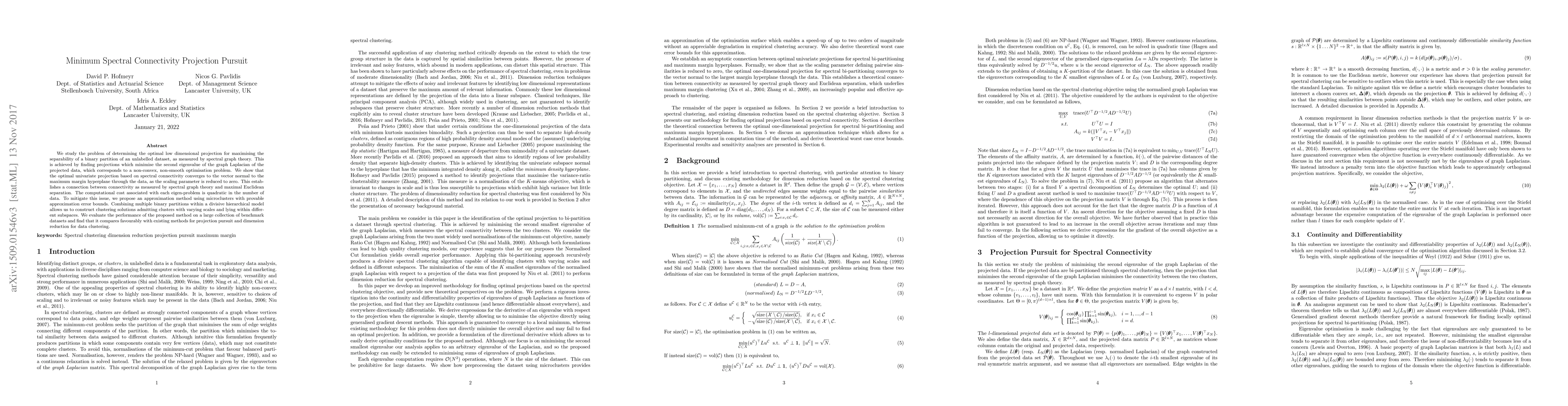 We study the problem of determining the optimal low dimensional projection for maximising the separability of a binary partition of an unlabelled dataset, as measured by spectral graph theory. This is achieved by finding projections which minimise the second eigenvalue of the graph Laplacian of the projected data, which corresponds to a non-convex, non-smooth optimisation problem. We show that the optimal univariate projection based on spectral connectivity converges to the vector normal to the maximum margin hyperplane through the data, as the scaling parameter is reduced to zero. This establishes a connection between connectivity as measured by spectral graph theory and maximal Euclidean separation. The computational cost associated with each eigen-problem is quadratic in the number of data. To mitigate this issue, we propose an approximation method using microclusters with provable approximation error bounds. Combining multiple binary partitions within a divisive hierarchical model allows us to construct clustering solutions admitting clusters with varying scales and lying within different subspaces. We evaluate the performance of the proposed method on a large collection of benchmark datasets and find that it compares favourably with existing methods for projection pursuit and dimension reduction for data clustering.