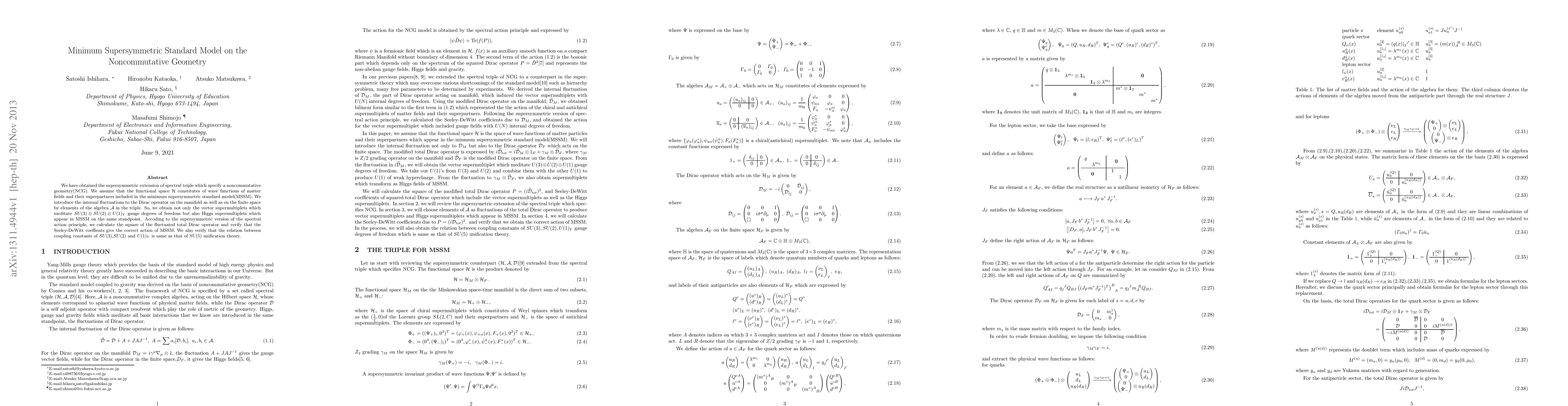 We have obtained the supersymmetric extension of spectral triple which specify a noncommutative geometry(NCG). We assume that the functional space H constitutes of wave functions of matter fields and their superpartners included in the minimum supersymmetric standard model(MSSM). We introduce the internal fluctuations to the Dirac operator on the manifold as well as on the finite space by elements of the algebra A in the triple. So, we obtain not only the vector supermultiplets which meditate SU(3)xSU(2)xU(1)_Y gauge degrees of freedom but also Higgs supermultiplets which appear in MSSM on the same standpoint. Accoding to the supersymmetric version of the spectral action principle, we calculate the square of the fluctuated total Dirac operator and verify that the Seeley-DeWitt coeffients give the correct action of MSSM. We also verify that the relation between coupling constants of $SU(3)$,$SU(2)$ and $U(1)_Y$ is same as that of SU(5) unification theory.