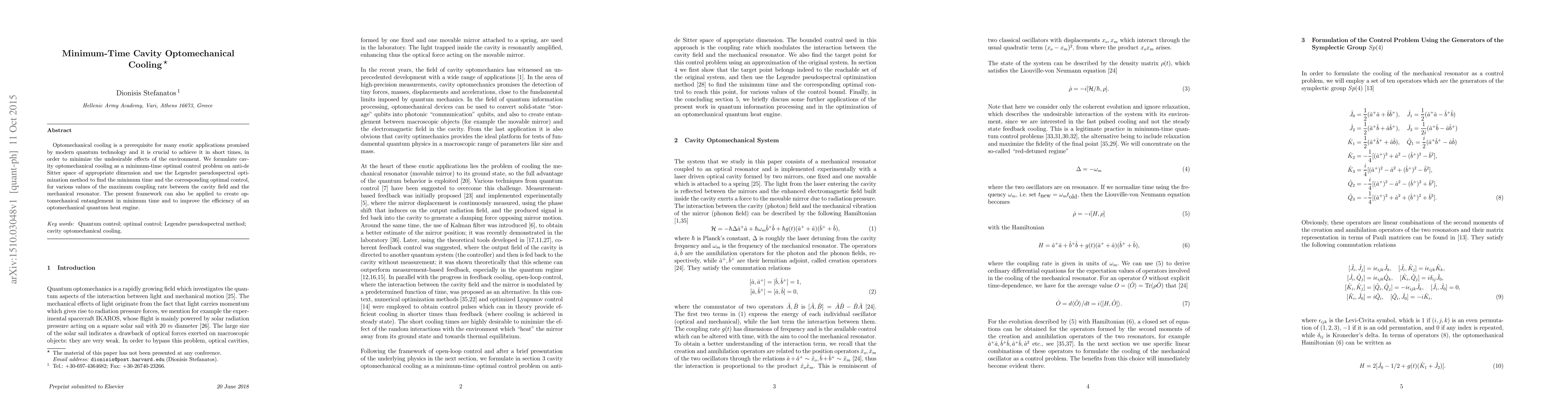 The research formulates cavity optomechanical cooling as a minimum-time optimal control problem on anti-de Sitter space, using the Legendre pseudospectral optimization method to find the minimum time and corresponding optimal control for various coupling rates.