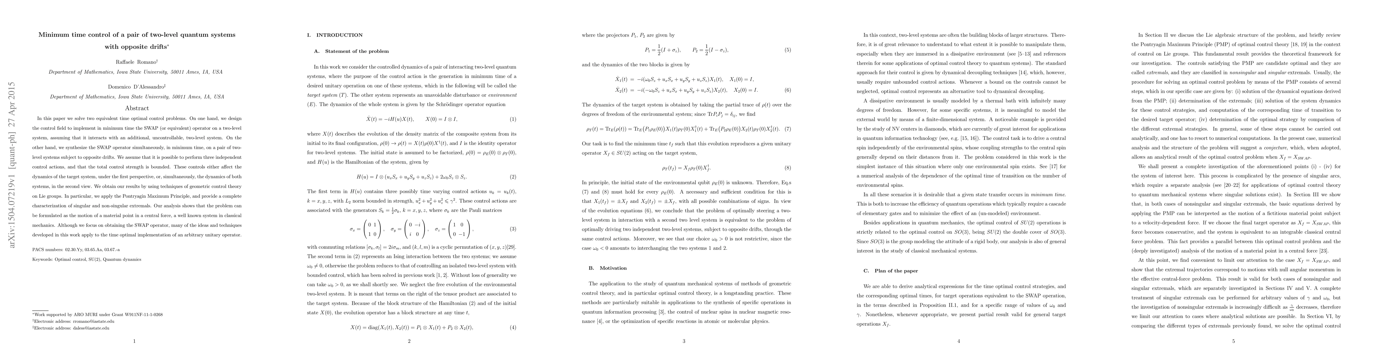 This paper addresses two time optimal control problems for two-level quantum systems, utilizing geometric control theory to design control fields that implement the SWAP operator in minimum time, either on a single system or on a pair with opposite drifts, and applies these techniques to arbitrary unitary operators.