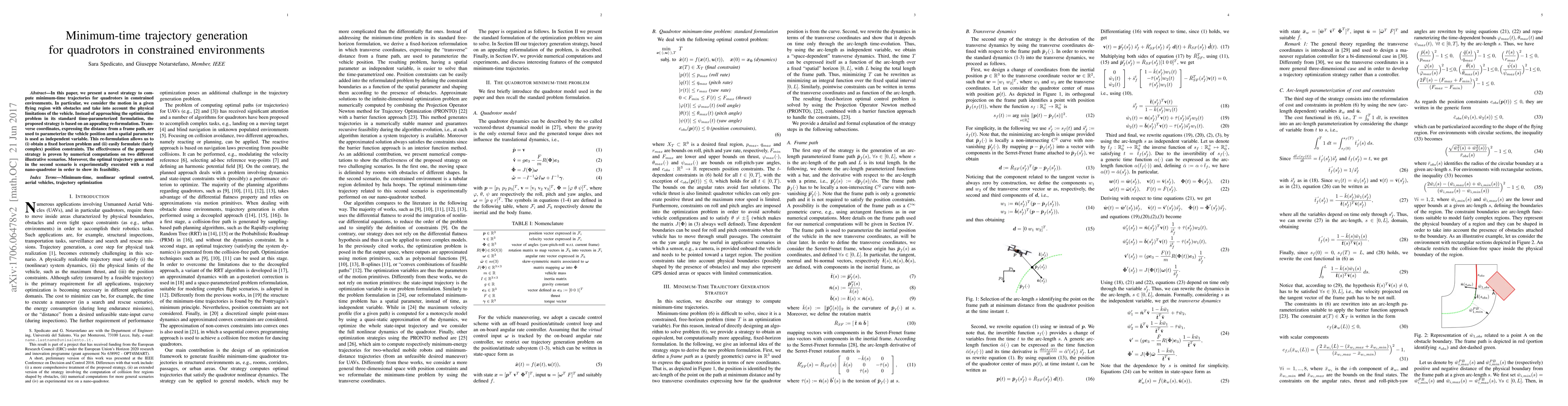 This paper introduces a novel strategy for generating minimum-time trajectories for quadrotors navigating constrained environments, utilizing transverse coordinates and a spatial parameter for re-formulation. The method simplifies constraint formulation and is validated through numerical simulations and real-world execution on a nano-quadrotor.