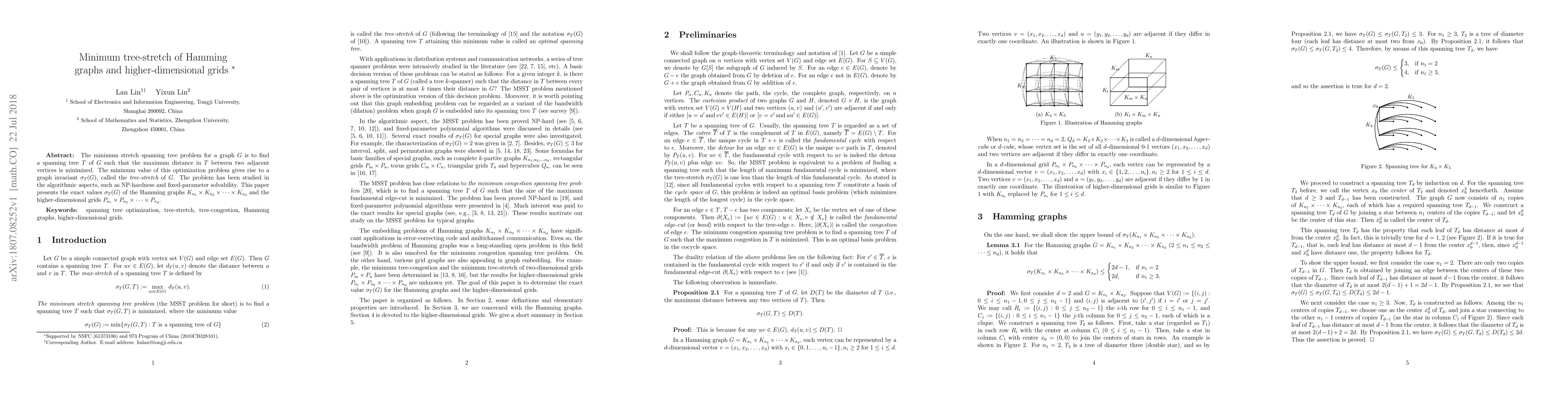 The minimum stretch spaning tree problem for a grah G is to find a spaning tree T of G such as that the maximum distance in T between two adjacent vertices is minimized. The minimum value of this optimization problem gives rise to a grpah invariant {\sigma} T(G) called the tree stretch of G. The problem has been studied in the algorithmic aspects, such as NP-hardness and fixed-parameter solvability. This paper presents the exact values {\sigma} T(G) of hamming graphs Kn1 * Kn2 * ... * Knd and the higer-dimensional grids Pn1 * Pn2 * ... * Pnd.