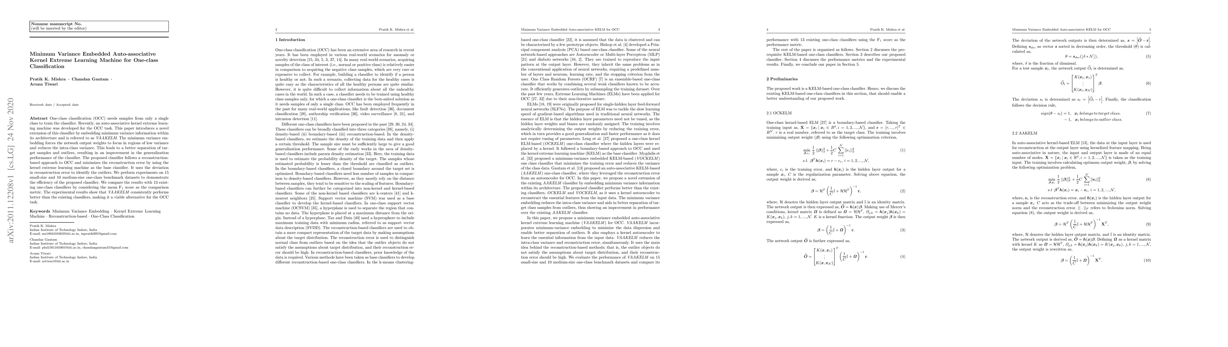This paper proposes VAAKELM, a minimum variance embedded auto-associative kernel extreme learning machine for one-class classification, which reduces intra-class variance and improves generalization performance. Experimental results show VAAKELM outperforms 13 existing classifiers on 25 benchmark datasets.