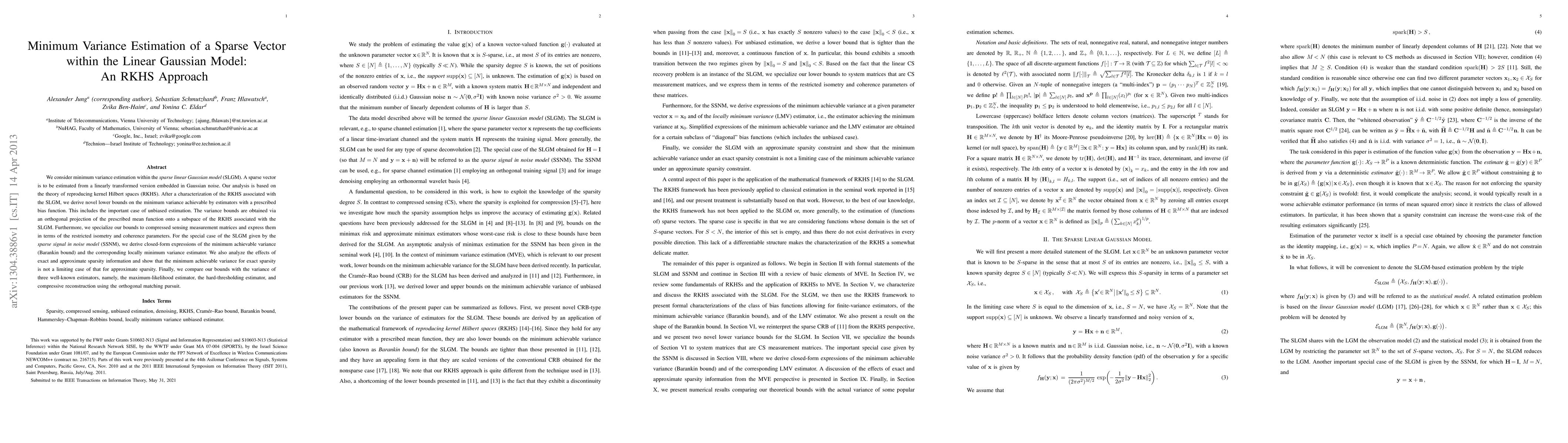 This paper explores minimum variance estimation in the sparse linear Gaussian model using reproducing kernel Hilbert spaces (RKHS). It derives novel lower bounds on minimum variance for estimators, including unbiased cases, and compares these bounds with established estimators like maximum-likelihood and orthogonal matching pursuit.