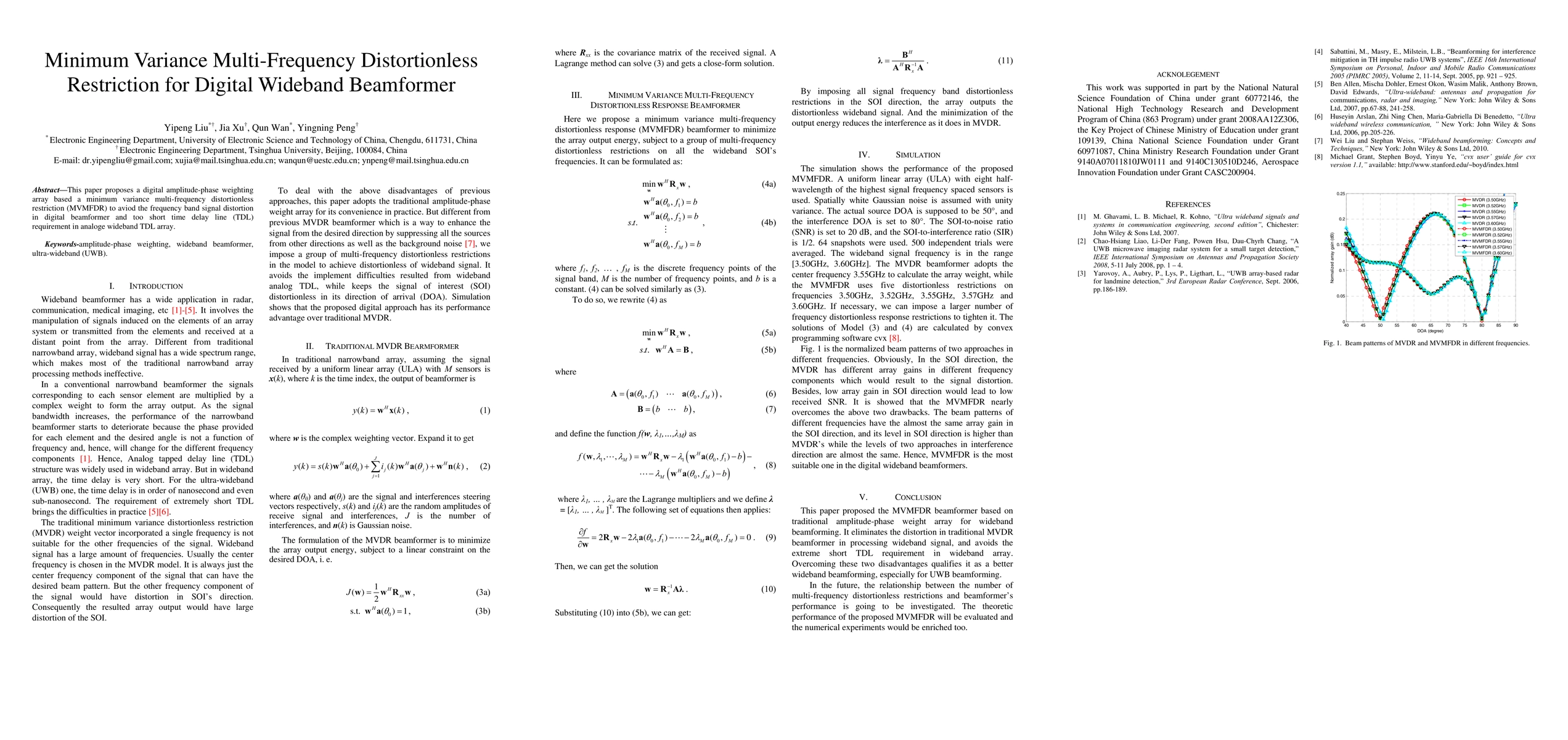 Summary: This paper introduces a digital beamformer using minimum variance multi-frequency distortionless restriction (MVMFDR) to prevent signal distortion across frequency bands and eliminate the need for short time delay lines in wideband analog arrays.
