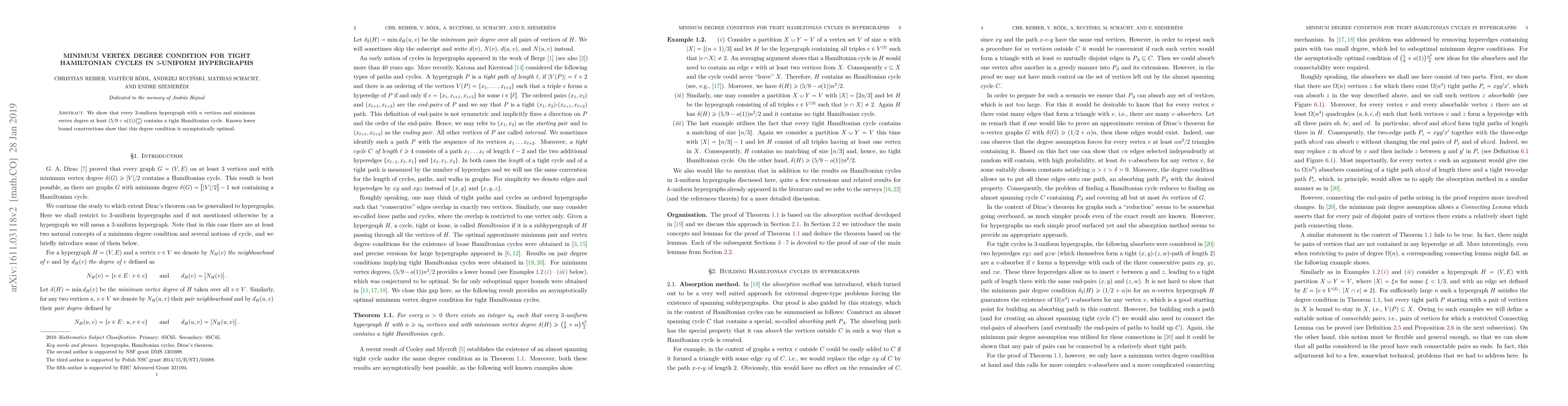 Summary: This paper proves that 3-uniform hypergraphs with a minimum vertex degree of at least $(5/9+o(1))\binom{n}2$ contain a tight Hamiltonian cycle, demonstrating that this degree condition is asymptotically optimal.