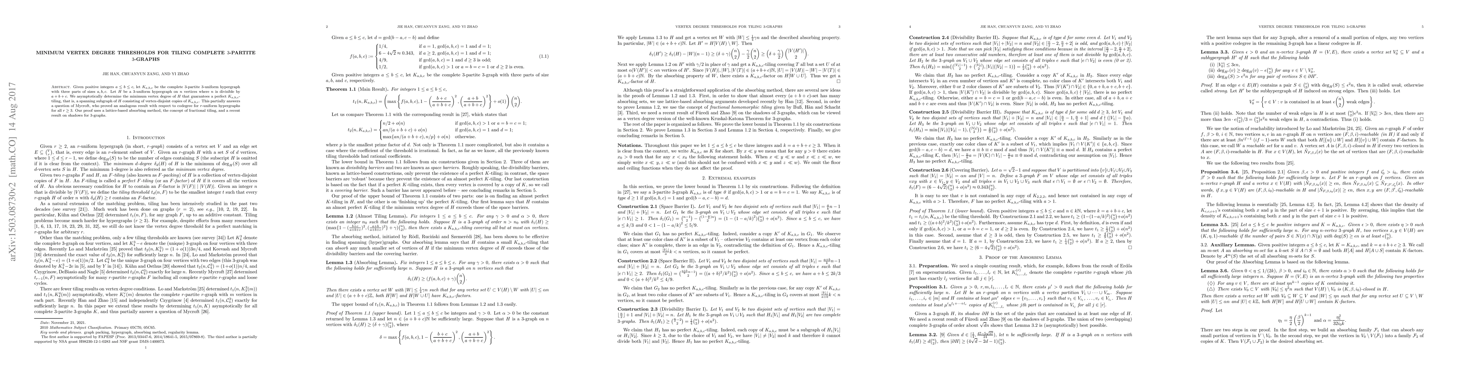 This paper determines the minimum vertex degree required for a 3-uniform hypergraph $H$ to guarantee a perfect tiling of a complete 3-partite 3-graph $K_{a, b, c}$, using a lattice-based absorbing method and fractional tiling. This result extends Mycroft's analogous codegree-based theorem for higher-uniform hypergraphs.